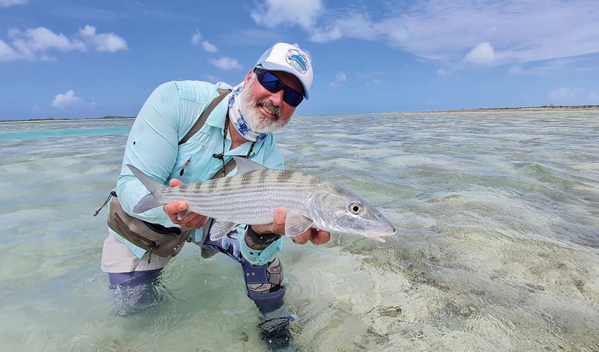Après un court trajet en bateau parfaitement équipé, nous foulons maintenant à pied le sol sablonneux jonché de conques, de gros coquillages très appréciés pour leurs qualités gustatives ! Orvil, notre guide du jour, et Herlé vont nous faire découvrir les « schools » (bancs) de bonefish. Bien souvent il faut repérer ces poissons de très loin grâce à des « nervous water », de petites surfaces d’eau en mouvement. En effet, vu la faible profondeur, les bonefish qui patrouillent en banc font bouger l’eau en cherchant leur pitance, qui se compose bien souvent de petits crabes et de crevettes. Les plus gros spécimens n’hésitent pas à se nourrir de poissons. Arnaud lance son imitation souple de crevette sur une canne spinning légère mais l’impact fait fuir le premier poisson. Il va falloir alléger le montage… Quant à moi, je repère plusieurs bonefish qui se faufilent entre de petits palétuviers. Pas facile de les attaquer dans cette forêt miniature sans se faire casser. Je ne lâche pas le banc des yeux et m’accroupis à la sortie d’une petite clairière qui me semble être favorable. Un premier fuseau d’argent apparaît, puis quatre ou cinq. Je pose ma mouche légère à deux mètres du premier. Un premier strip, rien ne se passe. Un second et le bonefish fonce sur mon imitation ! Ferrage canne basse main gauche en tirant sur la soie et me voilà déjà en train de courir derrière cette torpille qui tente de casser mon bas de ligne. Après une bagarre nerveuse, le poisson arrive enfin et il aura les honneurs du photographe. Nous prendrons une bonne quantité chacun de bonefish au leurre et à la mouche, grâce au talent de nos guides parfaitement affûtés et capables de repérer des « schools » à 200 mètres de notre position. Leurs yeux de lynx nous permettent de bien nous préparer, afin d’assurer des lancers très précis suivis d’animations ciselées !