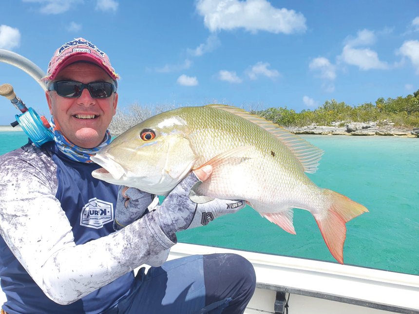 Nous décidons le lendemain de pêcher au leurre d’autres secteurs en bateau et notre guide Chris a bien compris nos intentions. Nous allons tenter les autres espèces qui sont nombreuses dans les chenaux plus profonds. Curieusement, au leurre, il ne faut pas exagérer la taille et nos essais avec de gros poppers et stickbaits ne donneront pas grand-chose. Nous avons obtenu les meilleurs résultats avec des leurres entre 8 et 12 cm. Pour ma part les 3D Inshore Twitchbait YoZuri de 9 cm de couleur bleu et Ayu ainsi que les Baïner Sakura 105 SSP m’ont rapporté le plus de captures diverses et variées, ainsi que les plus grosses prises. Ce sont tout d’abord les carangues « œil de cheval » qui ont mis à mal nos bas de ligne avec des combats version « bastons » sous le bateau ! Un régal. Arnaud a mis au sec de superbes barracudas, dont quelques gros sujets, en animant un stickbait coulant Rapala à grande vitesse au-dessus des récifs. Bien sûr, dès que les « barras » entrent dans la danse, vous n’aurez plus le choix, il vous faudra un bas de ligne en acier ou titane pour éviter des coupes récurrentes ! Préférez un solide anneau brisé pour changer rapidement de leurre en lieu et place des agrafes classiques. Il est un poisson que j’ai particulièrement apprécié, c’est le « mutton snapper » (Lutjanus analis) ou Vivaneau, un combattant absolument magnifique ! J’ai eu la chance de piquer à plusieurs reprises de très beaux spécimens, dont un de plus de 10 livres, et je peux vous dire que cette espèce est particulièrement sportive au leurre comme à la mouche en soie de 10 !