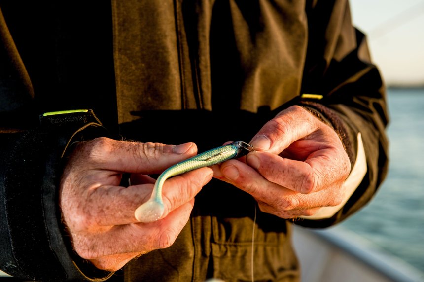 Le courant de montante étant installé, de nouvelles veines se dessinent dans le golfe. Pierre-Yves place le bateau sur une dérive à proximité de la bordure de l’île aux Moines. Notre guide nous indique que c’est une dérive qui n’est pas facile à pêcher au leurre souple car les fonds sont rocheux et très irréguliers mais aussi parce que le courant est rapide. Mais ce sont aussi ces caractéristiques de poste qui font que le poisson est présent sur la zone. La tenue de la ligne sera donc primordiale pour réussir à pêcher le spot. Pierre-Yves nous conseille un leurre qui vibre fort pour se faire repérer des bars dans le courant, le Madshad (marque Madness) en taille 100, armé d’une tête Xorus Ultihead ou Rolling Mate avec un grammage de 20 g. Ses préférences de coloris s’orientent vers le Black Iwashi et le Dorado Iwashi. Les leurres sont montés, nous lançons et nous appliquons les conseils du guide. C’est en voyant le paysage défilé que nous nous apercevons de notre vitesse de dérive, c’est tout simplement impressionnant! La dérive terminée, Pierre-Yves décide de replacer le bateau mais de décaler de quelques mètres son placement. Les yeux rivés sur le GPS et le sondeur, Pierre-Yves nous avertit que nous allons passer à proximité d’une tête de roche et que dans le tombant qui suit il y a souvent quelques poissons en maraude. Il nous conseille donc un petit linéaire pour décoller le leurre du fond et passer la tête de roche sans crocher et de relâcher ensuite un peu de bannière pour pêcher le tombant. Concentrés, nous essayons d’appliquer les conseils, soudain, c’est la touche pour Leeroy ! Le poisson est bien ferré et nous offre un beau combat dans le courant : un coup il va dans le sens du courant, un autre à contre-courant. Un dernier rush au bateau et Pierre-Yves l’épuisette. C’est un joli bar du golfe au dos bien noir calibré à une cinquantaine de centimètres. Pierre-Yves replacera à plusieurs reprises le bateau sur le secteur et les bars se montreront coopératifs. Cette journée dans le golfe du Morbihan aura été un vrai bonheur : un paysage magnifique offrant un dépaysement total et du poisson en nombre et varié. Le golfe du Morbihan est un véritable paradis pour le pêcheur à la ligne car il peut s’adonner à des techniques diverses (pêche à l’appât et pêche aux leurres) et complémentaires. On ne peut que vous conseiller de passer un moment en compagnie de Pierre-Yves Perrodo, guide professionnel reconnu sur le golfe. Pierre-Yves mettra tout en œuvre pour que vous puissiez découvrir la pêche dans ce lieu unique dans les meilleures conditions, sa sympathie, sa convivialité et son expertise du golfe feront de cette sortie un moment unique.
