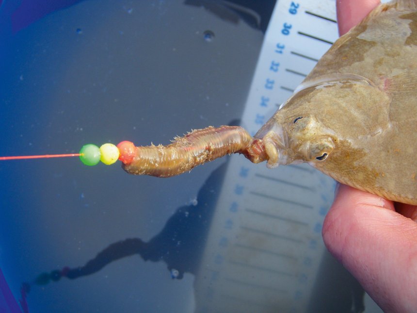 Dans leurs déplacements, les plats se classent dans les poissons lents. Généralement, ils réalisent de petites touches brèves avant de se caler sur le fond. Néanmoins, les plus belles pièces sont capables de détendre la ligne, voire d’emmener le montage en créant une dérive. Dès que vous voyez la touche, prenez le temps d’escher un second montage afin d’optimiser votre temps de pêche. Le ferrage est inutile car lorsque le poisson s’ensable, il se pique automatiquement avec la tension de la ligne ou du plomb. Les hameçons à hampe longue (Aberdeen), généralement utilisés pour escher les vers marins, sont excellents pour une parfaite présentation. En effet, la longue hampe favorise l’auto-ferrage mais assurent aussi un décrochage plus facile pour ces poissons qui ont la fâcheuse tendance à engamer profondément les appâts. À cette période de l’année, les incontournables restent les vers ramassés sur place ou achetés chez votre détaillant.