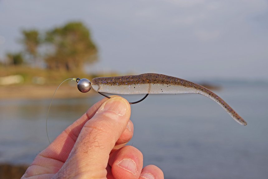 S’agissant de la taille de cet hameçon, celle de sa hampe doit correspondre approximativement au tiers de celle du leurre, en tout cas jamais plus de la moitié. Enfin, toujours pour des raisons d’efficacité du ferrage, il faut privilégier les leurres dont la gomme est hyper souple, ce qui facilite le dégagement de la pointe sous la pression des mâchoires du poisson.