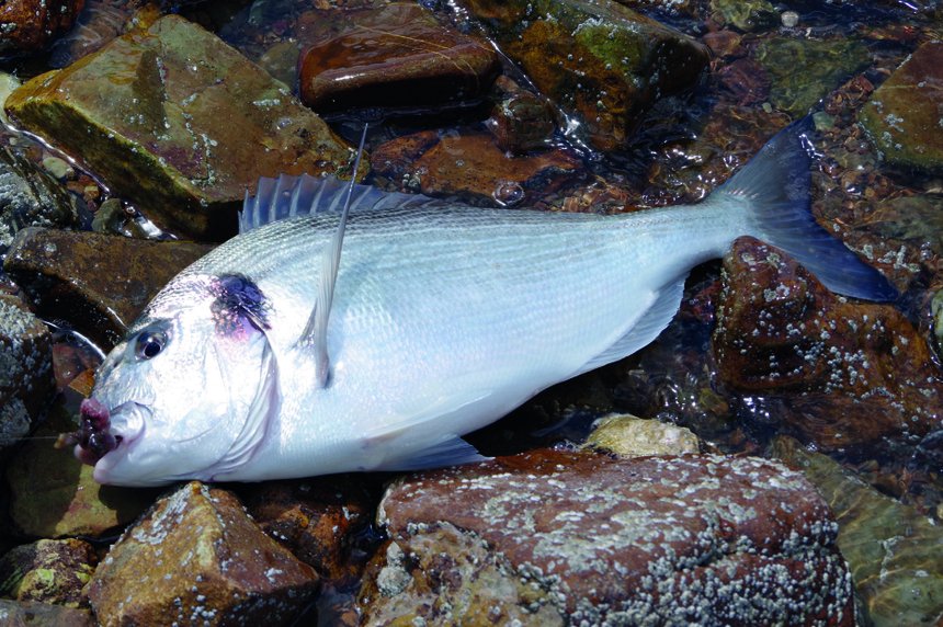 Gilbert a de cette façon déjà réalisé des séries de six à huit poissons pour un poids moyen de 3,5 kg ! « Juin est le meilleur mois, précise Gilbert, quand la température de l’eau atteint 14 °C. La daurade royale peut être active la nuit et ne craint pas le soleil. Un léger vent (ouest, sud, sud-ouest) est prometteur. » Gilbert vise plutôt les coefficients de marée moyens (60 à 85) qui génèrent des mouvements d’eau sans violence. Il privilégie les deuxième et quatrième heures de marée quand le courant s’accentue pour atteindre sa puissance maximale à la quatrième heure. Dans ses moulinets, Gilbert préfère le nylon qui résiste mieux aux frottements que la tresse et permet d’amortir le contact avec le scion à la touche. Il estime aussi que le nylon est moins sonore qu’une tresse tendue.