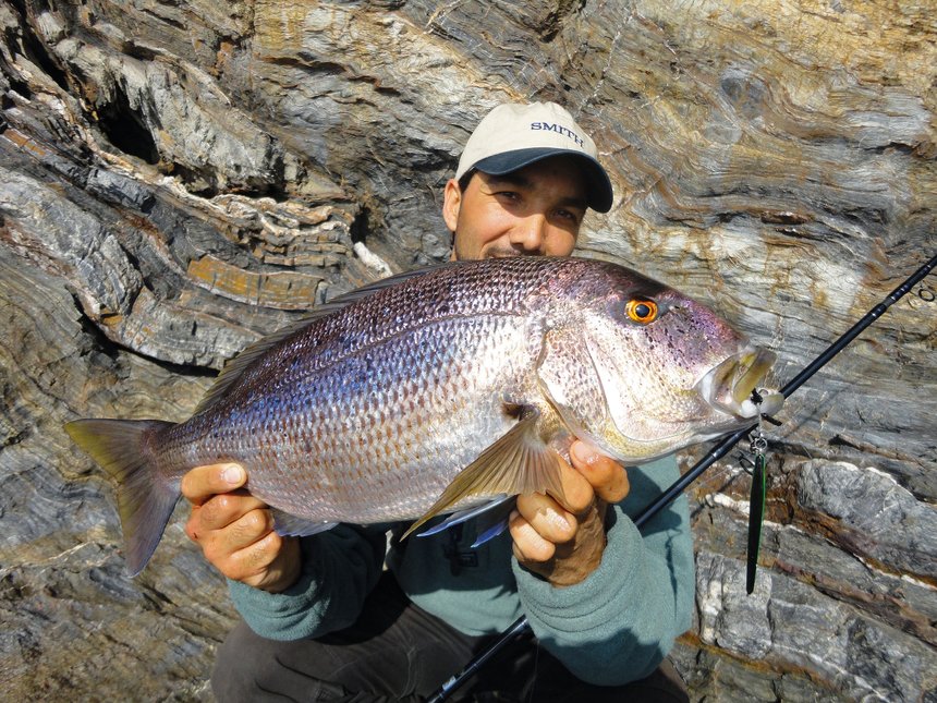 Michaël estime enfin que le shore jigging est essentiellement une pratique diurne tant l’aspect visuel a son importance, l’obligeant à adapter les coloris de ses leurres en fonction de la journée. Au lever du jour et à la tombée de la nuit, il mise généralement sur le blanc et le rose pour basculer sur le bleu en pleine journée. Par temps couvert, Michaël opte pour un coloris noir-argent. Et pour lui, vert et orange sont ses jokers, quand rien n’a vraiment fonctionné ! Michaël différencie deux types d’animations bien distinctes. La première concerne les poissons de roches, principalement les sparidés : sar, daurade, pagre, denti… Après avoir déterminé sa distance de lancer, Michaël fait descendre son jig jusqu’au fond, laissant la tresse filer entre ses doigts pour garder le contact car les touches survenant à la descente sont fréquentes.