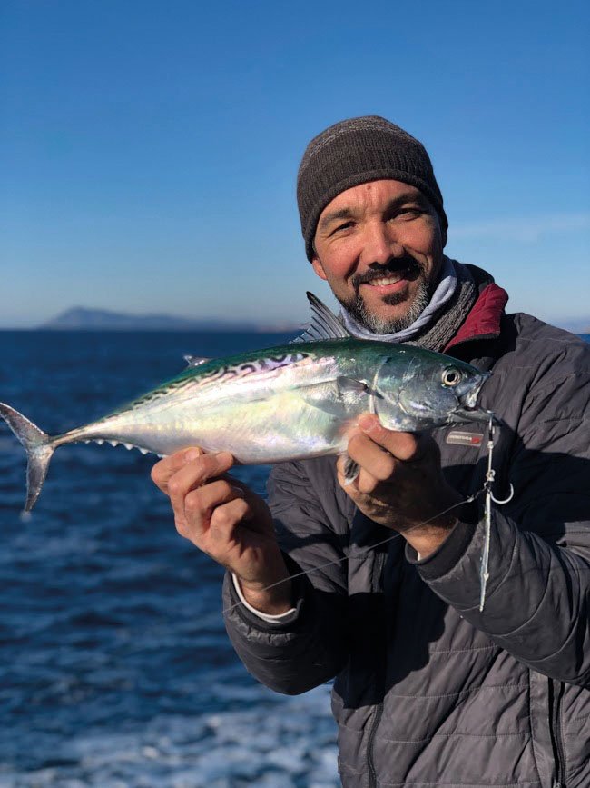 Le poids des jigs utilisés, avec une moyenne de 60 g, est déterminé en fonction du vent et du courant. Par conditions difficiles, Michaël peut monter jusqu’à 80 g. « La forme du leurre est très importante dans ma stratégie, tient-il à préciser. Avec les jigs larges, je vise les poissons de fond mais leur utilisation est plus fatigante. Pour les pélagiques, mes modèles sont au contraire effilés. Ils fendent mieux l’eau et la pêche est plus agréable ! » Michaël arme ses jigs de deux assist-hooks en tête, en prenant toujours soin que l’écart entre la hampe et la pointe de l’hameçon soit supérieur à la largeur du leurre. Il rajoute parfois un hameçon sur l’arrière du leurre quand les poissons de pleine eau semblent un peu délicats.
