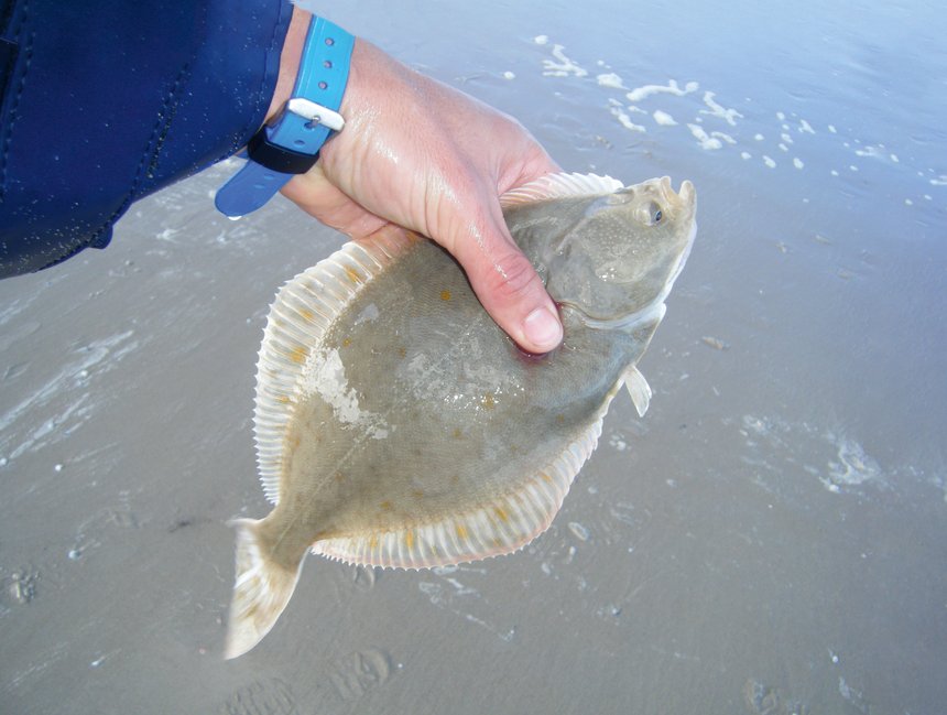 Le début de saison est également propice à la capture de poissons plats. Il sera possible pour vous de trouver flets, carrelets, soles, raies en nombre. Également quelques turbots ainsi que les limandes (souvent plus petits qu’en hiver). À cette période de l’année, les poissons sont plutôt de belle taille, il ne faudra donc pas hésiter sur le volume des bouchées. Les poissons plats chassent sur le fond et dans les bâches, là où les crevettes et autres crustacés s’entassent avec le courant de marée. Ces poissons suivent le mouvement de marée et restent souvent à même distance de pêche. Pour exemple, la pêche de basse mer se pratique à longue distance car le poisson a reculé avec la marée. Il refera son apparition généralement juste après le début de marée montante, là où le courant s’inverse. Il franchira successivement les bâches, les plateaux en suivant la topologie du terrain pour venir se caler au pied, voire dans les pentes à pleine mer. On pourra le trouver alors dans les trous avec de belles hauteurs d’eau, puis dans très peu d’eau, 30 cm suffisent à franchir l’obstacle pour se caler dans la bâche ! On pêche les poissons plats sur le fond, mais aussi de plus en plus décollé du sable à l’aide des perles flottantes. Les poissons plats ont les yeux placés sur le dessus du corps, leur champ de vision est donc situé vers le haut. Il ne sera donc pas rare de piquer un poisson sur une perle flottante ! À noter également que les poissons plats sont très chasseurs, pour preuve, dans les pays nordiques, ils sont souvent pêchés à la tirette sur des montages munis d’une cuiller.