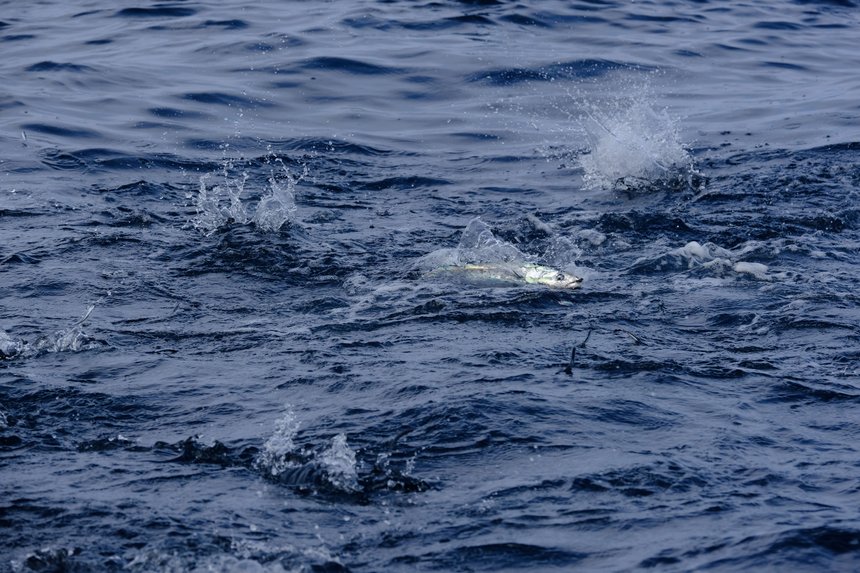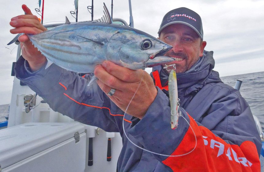 Attaquer des chasses de thons avec du matériel léger et des leurres de surface vous assure de bonnes montées d’adrénaline même si le combat n’est pas comparable à celui que peut offrir le thon rouge bien sûr, mais il reste très grisant tout de même. Il est bon de savoir à qui on a affaire avant de lancer son leurre dans une chasse de thons ! Il est parfois difficile de différencier une chasse de jeunes thons rouges d’une chasse de listao, les juvéniles de thons rouges étant parfois de taille identique à la bonite à ventre rayé. La petite astuce consiste à observer la chasse, si un poisson sort de l’eau et bondit au-dessus de la surface il s’agit de thons rouges. Le listao ne sort jamais de l’eau. Le combat du thon rouge étant plus violent cela pourra vous éviter bien des déboires ou de piquer un thon rouge plus imposant mélangé à de petits sujets.
