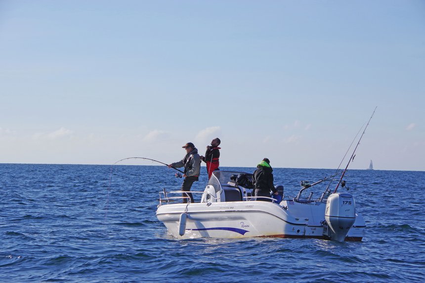La météo annonce une mer calme, propice pour repérer les chasses. « Je préfère débuter tôt le matin car le poisson, moins dérangé, vient près de la côte, explique Patrick. Les chasses sont plus fréquentes et durent plus longtemps ! » Afin de mettre toutes les chances de notre côté, deux bateaux «amis» nous accompagnent. Nous gagnons vite le large, d’autant qu’il est inutile d’aller loin en cette belle saison automnale. Et à moins de deux milles, en effet, nous repérons déjà les premières chasses. Sous un véritable ballet d’oiseaux, les thons, alliés aux dauphins, n’hésitent pas à sauter entièrement hors de l’eau, soulevant d’impressionnantes gerbes. Un carnage fascinant, thons et dauphins se jetant sur tout ce qui bouge, les goélands récupérant en surface le menu fretin étourdi. Parfois, rien n’est visible, les chasses se déroulent en profondeur. Il arrive aussi que l’on n’observe que quelques oiseaux et remous discrets. Des oiseaux simplement posés sur l’eau sont également intéressants. Ils peuvent être là après qu’un carnage vient de s’achever ou, au contraire, parce qu’ils anticipent une chasse imminente. On comprend que la paire de jumelles est indispensable. Quoi qu’il en soit, la méfiance naturelle de ces grands pélagiques laisse peu de temps pour réagir et lancer. Ils peuvent nager à plus de 70 km/h et la réactivité est essentielle. « Une chasse peut disparaître aussi vite qu’elle est apparue, confirme Patrick. Il faut anticiper, plus vite on est sur zone, plus vite on peut lancer ! »