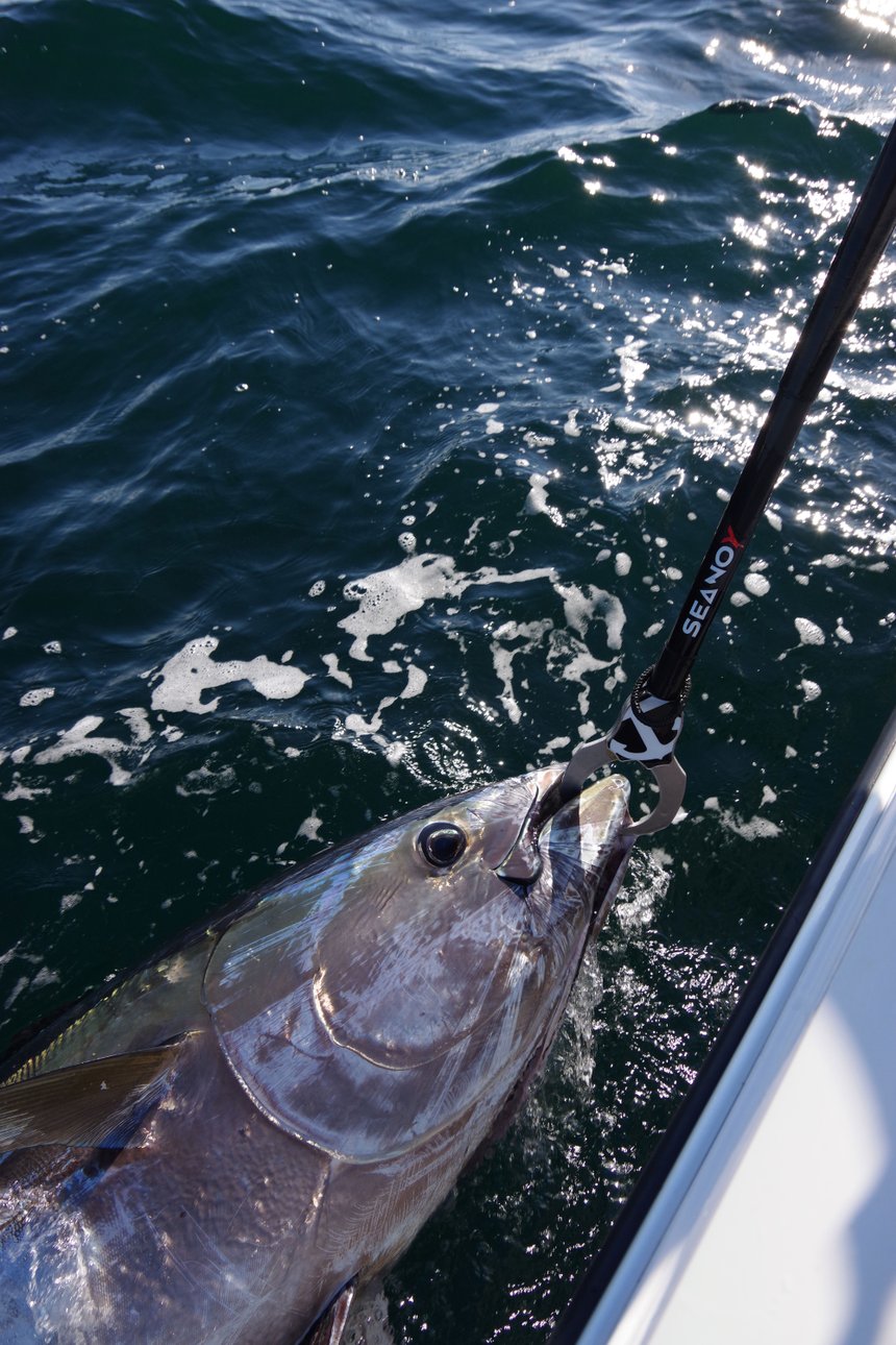 Avec ces forces de la nature, il faut surtout s’assurer de la qualité des hameçons et des anneaux brisés. « Je relie mon bas de ligne à la tresse par le fameux nœud FG, me précise Patrick. C’est le seul qui passe bien dans les anneaux et tient le choc face à ces mastodontes ! » Patrick positionne son bateau avec discrétion et précision et le résultat ne se fait pas attendre. Après trois ou quatre lancers, il est attelé. Le thon, après un démarrage en trombe, fait subitement demi-tour, fonçant vers le bateau. On pense un instant qu’il s’est décroché, en fait, il n’en est rien. Mais à 15m du bateau, la tresse fend l’eau dans un bruit de papier déchiré. Le poisson repart vers le large, le moulinet hurle… et puis plus rien ! Cette fois, le thon s’est bel et bien décroché.