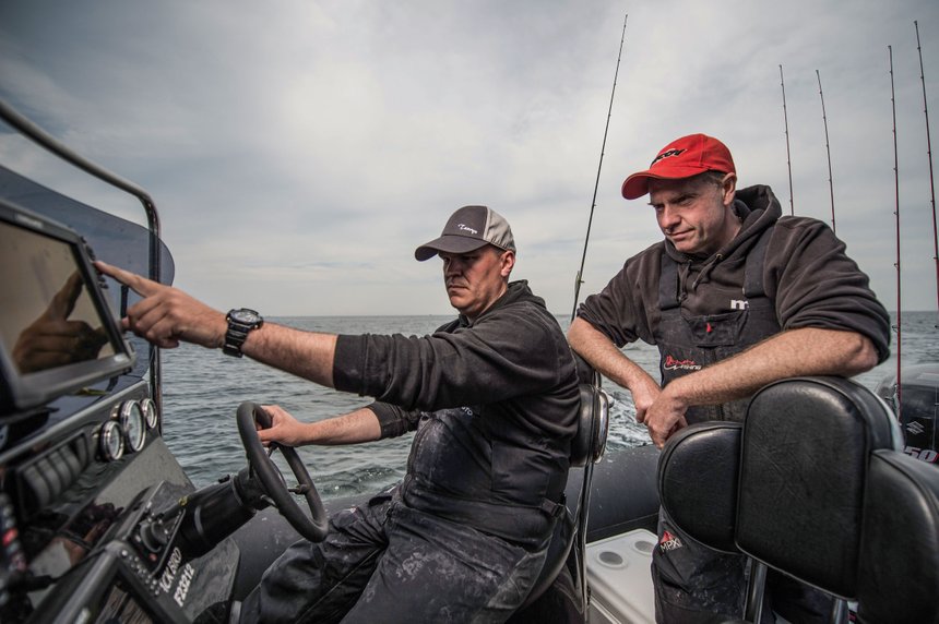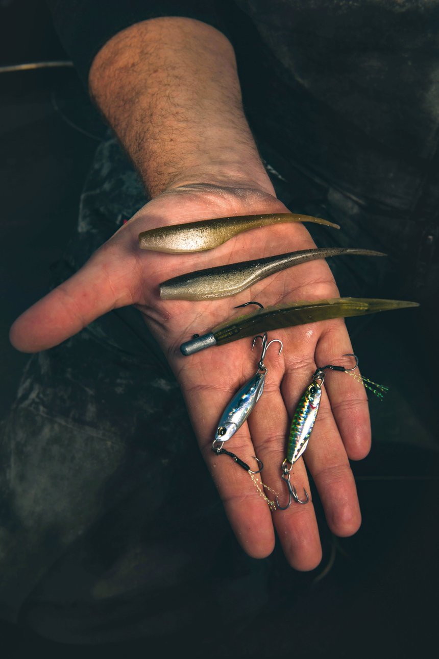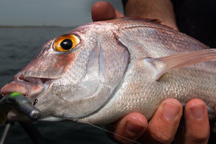 Les leurres souples pour la pêche du pagre en verticale sont des slugs ou des shads montés sur des têtes plombées à la forme profilée pour l’animation en mode vertical. Certains pêcheurs ajoutent un triple « voleur » fixé sur la queue du souple et raccordé à la tête plombée par un brin de tresse, montage bien connu des pêcheurs de sandre. Le pagre n’est pas doté d’une bouche très large comme le bar et il lui arrive de saisir le leurre par la queue. L’hameçon voleur évite alors la touche loupée suivie d’une remontée de leurre sectionné. Le poids des têtes plombées dépend de la profondeur et du courant. Concernant les couleurs, les modèles clairs de teinte naturelle semblent avoir la faveur des pagres. Bruno a déjà placé le bateau avec précision et nous commençons notre dérive. Nous sommes tous les trois synchronisés et lançons au même moment. Nos trois leurres touchent l’eau : c’est parti ! Il faut bien se concentrer pour visualiser mentalement le déplacement du leurre dans l’eau. Après quelques secondes de descente, il touche le fond. Le « toc » dans la canne nous indique l’impact sur le substrat dur.