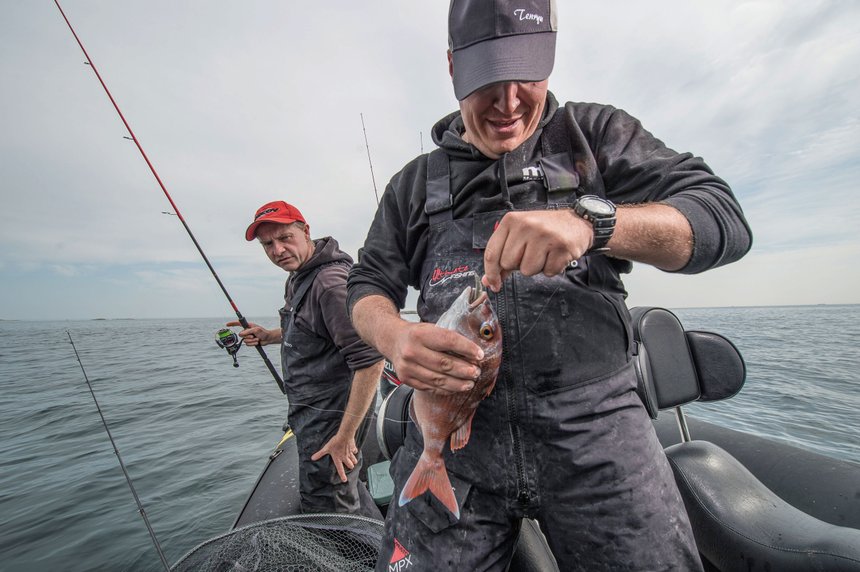 L’animation est classique, c’est une animation en vertical. Il faut décoller le leurre du fond par une grande traction de bas en haut et accompagner la ligne lors de la descente du leurre. Il est important d’être très attentif lors de la phase de descente, en effet, c’est souvent au cours de celle-ci que la touche se produit. Parfois les pagres évoluent au-dessus du fond et viennent saisir un leurre qui s’agite plusieurs mètres au-dessus. Dans ce cas il est nécessaire de pêcher en pleine eau en faisant remonter le leurre, avec quelques tours de manivelle, plus ou moins rapidement, dans la colonne d’eau. Cette technique peut se pratiquer avec différents leurres, qu’ils soient souples comme des slugs ou des shads mais aussi des jigs. Les petits jigs sont d’excellents leurres à pagre, notamment par l’avantage de ne pas craindre les dents acérées de la bête ! La première touche ne se fait pas attendre ! Le leurre de Romain se fait attaquer dès la première descente. Comme d’habitude avec les pagres, le combat est puissant et les longs rushs donnent le sourire… Romain est un pêcheur expérimenté et bientôt le poisson est remonté à bord. Notre chanceux pêcheur se saisit délicatement de sa prise et veille à ne pas mettre ses doigts à proximité de la bouche du pagre, armée de dents acérées. Le pagre repose sur le fond du bateau et nous pouvons maintenant l’observer en détail. C’est confirmé, la dentition du pagre n’a rien à envier à celle de la dorade royale. Le plus impressionnant est sa couleur… Et que dire de la robe rouge avec de magnifiques reflets bleu argenté de ce superbe poisson ? Un poisson exotique dans un décor digne des Caraïbes, décidément la Bretagne nous réserve bien des surprises !