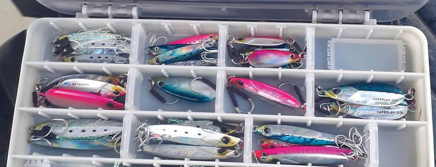 Les leurres de petite taille sont bénéfiques en cette période, ils sont avant tout proportionnés et adaptés à l’espèce ciblée, les maquereaux ! De plus, ces petits leurres reproduisent et imitent parfaitement les proies dont se nourrissent les prédateurs, dans des tailles similaires. Le choix du modèle varie selon la configuration du poste, et l’aisance de chacun avec le modèle que l’on préfère employer. Nous avons tous une préférence sur un leurre fétiche ou un modèle que l’on trouve plus pêchant. Dans cette approche, vous pouvez aussi bien utiliser des petits leurres souples, que des leurres métalliques. Il est également possible de monter une ou deux plumes sur le bas de ligne en guise de teaser et multiplier les prises, pour ceux qui souhaitent rendre les combats plus sportifs sur du matériel léger. De mon côté, j’utilise des petits shads dans les zones à faible profondeur, et en fin de marée lorsque le courant baisse. J’emploie la plupart du temps des castings jigs de 20 à 50 g. À noter que pour ce mode de pêche, le Biastos Fast de Caperlan est vraiment prenant sur les maquereaux et bien d’autres espèces encore. Sa réalisation est vraiment bien finie, il reproduit parfaitement le réalisme d’une proie. Sa petite taille s’avère extrêmement efficace sur les poissons bleus. Sa forme longiligne et asymétrique assure un très bon équilibre et permet d’accomplir de longues distances de lancer.