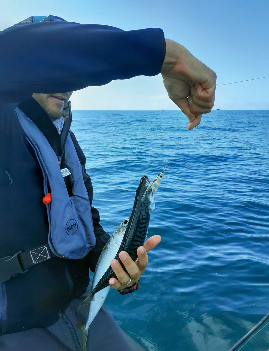 L’électronique embarquée est fondamentale dans la construction de votre approche de pêche, elle vous indique la profondeur dans laquelle se trouvent les échos de poissons renvoyés par la sonde, l’indicateur de vitesse de dérive et surtout la topographie du fond et la température d’eau. Ces éléments sont déterminants pour suivre le déplacement des maquereaux qui redescendent dans les colonnes d’eaux quand le courant mollit. Dans cette approche, le bon compromis est l’usage d’une canne leurre, d’une fourchette de puissance de 7 à 28 g, équipé d’un moulinet de gabarit 3000, afin de conserver le côté ludique de cette pêche. Garnissez-le d’une tresse de 10 à 12/100, suivi d’un bout de fluorocarbone de 25/100 à 30/100. Côté longueur, les cannes de 2,10 m à 2,25 m sont idéales pour la pêche en bateau.