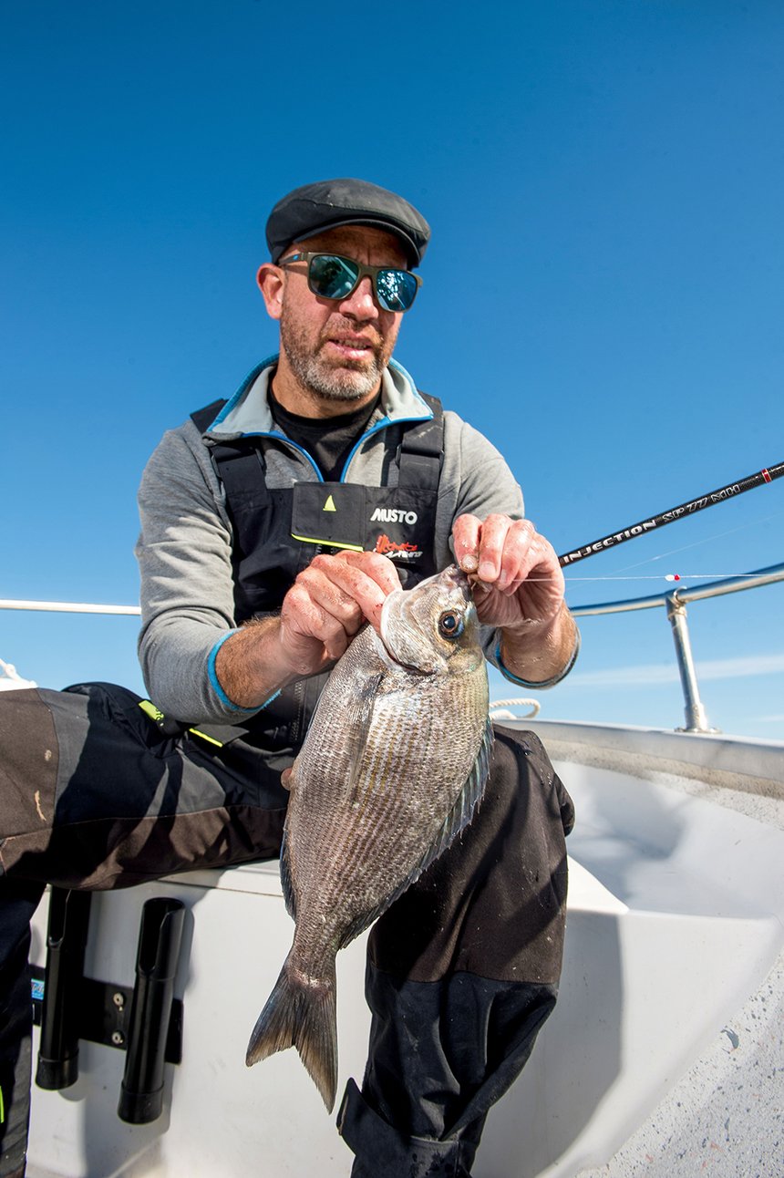 La technique de pêche est assez simple : il faut pêcher à l’aplomb du bateau, plomb posé au fond et ligne tendue. Notre ami nous avertit qu’il va falloir attendre un peu avant que les daurades se mettent sur la piste odorante de la strouille et trouvent nos appâts. « En général, si elles sont actives, il faut une petite trentaine de minutes avant d’espérer une première touche. » Nous gardons un œil sur l’aiguille de la montre et l’autre sur le scion de la canne. Finalement, il faut à peine 15 minutes pour sentir le premier poisson qui tire légèrement à l’autre bout de la ligne. Un ferrage puissant, et nous sentons le poids de la daurade au bout de la canne. Notre première daurade grise est bien piquée. Nous remontons notre poisson pendant que Pierre-Yves combat un autre individu. L’heure qui suit est un vrai régal : les touches se succèdent et nous remontons à bord une ribambelle de daurades. Sur le bateau, l’ambiance est à la franche rigolade. Les touches sont nombreuses et cette pêche ludique offre peu de temps morts. Une jolie vieille, aux couleurs éclatantes, s’est, elle aussi, laissée tenter par un juteux morceau de coquillage. Après deux heures de pêche, les touches se calment. Les poissons ont probablement bougé avec la marée, nous annonce Pierre-Yves. Il est temps de se poser un peu, et notre guide ouvre une seconde glacière pour se saisir de victuailles qui, cette fois-ci, nous sont destinées.