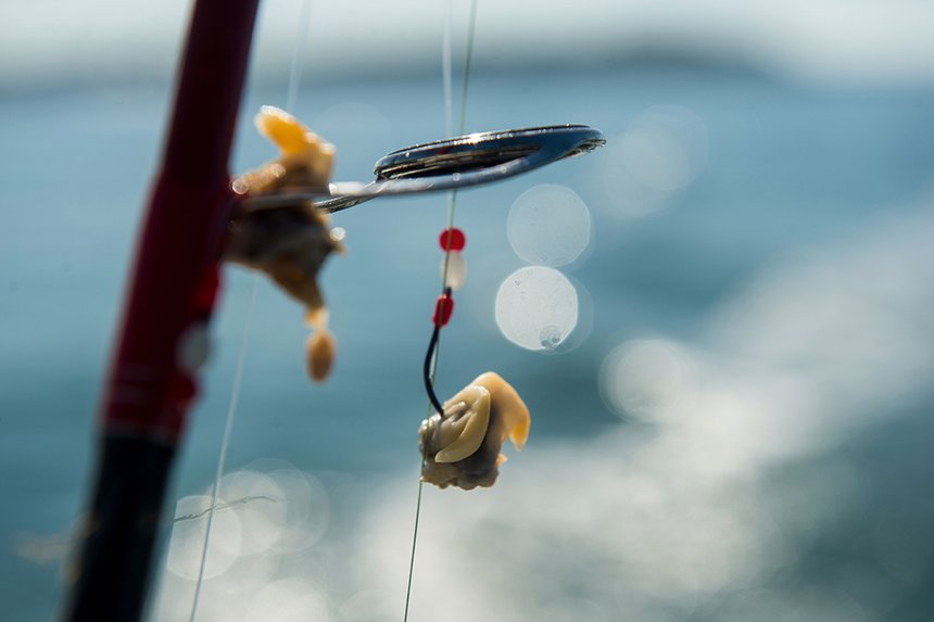 Premier spot et premiers échos, la zone semble être occupée par nos chères daurades. Notre ami coupe le moteur et descend une ancre sur le fond. Nous voilà calés, et le bateau ne dérivera pas avec le courant. Étape deux de la pêche de la daurade : strouiller. Il n’y a rien de tel pour faire venir les poissons sur la zone de pêche et pour les mettre en appétit. Chaque pêcheur a sa recette, gardée secrète, et contenant souvent un ingrédient magique qui fait la différence. Pierre-Yves a longtemps fait sa propre préparation, mais aujourd’hui, il utilise un pain de strouille de 3 kg (sardine pure broyée et compactée, de la marque Pexeo). Il place le pain dans un panier à strouille. Le panier est lourdement lesté, afin de rester à l’aplomb du bateau et à un mètre du fond. Il fait descendre le panier à l’avant du bateau, et nous pêcherons à l’arrière. Pierre-Yves se dirige vers la glacière. L’heure nous semble pourtant un peu matinale pour une boisson fraîche… Finalement, ce n’est pas un verre de blanc qui nous est proposé, mais un sachet contenant des morceaux de coquillages. Notre pêcheur utilise différents appâts : chair de coque, chair d’amande (un petit mollusque), chipiron, pied de couteau. Les daurades sont de fins palets et il est important que les appâts soient très frais. Pour cela, Pierre-Yves les conserve donc dans une glacière avec des pains de glace.