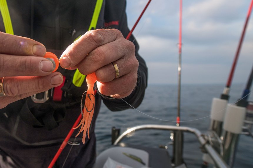 Il existe des cannes prévues spécialement pour la pêche au tenya, mais Gaël utilise avec succès une canne destinée à la pêche aux leurres ayant une pointe sensible et souple. Les leurres : pour pouvoir répondre à toutes les situations, il faut avoir plusieurs grammages dans sa boîte. Le leurre doit être le plus possible à l’aplomb du bateau, et en fonction de la profondeur, du courant, du sens de la dérive, il va falloir adapter le poids du montage. La couleur favorite de Gaël est l’orange et certains tons sombres.