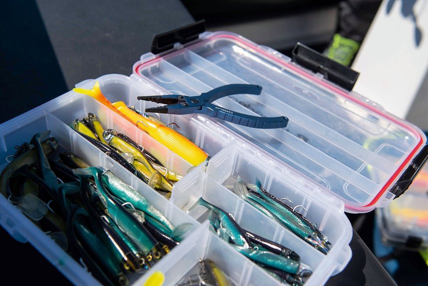 Les bars se nourrissent de petites proies en cette période, composés de sprats, d’éperlans et de lançons, et il est nécessaire d’utiliser des leurres de 10 à 12 cm pour les shads, et 15 cm pour les imitations de lançons. Le but est qu’ils se rapprochent le plus possible des proies consommées par les bars. Les coloris clairs tels que le blanc, le bleu, le vert, sont attrayants et conservent le minimalisme d’une proie. Ils rendent ainsi les bars moins hésitants sur leur choix et ils portent leurs attaques instantanément. Tout en conservant les mêmes couleurs, vous pouvez également utiliser des modèles de leurres pailletés, dont la luminosité accentue les reflets. Concernant les têtes plombées, choisissez des grammages de 15 à 25 g, pour les zones peu profondes moyennant les 10 à 15 m, et notamment pour les pêches actives comme la volée. Sur les zones plus profondes jusqu’à 30 m, la pêche à gratter fonctionne bien. En effet, du fait du positionnement des bars sur le sable en contrebas des tombants, cette technique procure de bons résultats. Pour bien faire, utilisez des modèles de 30 à 50 g, afin de garder parfaitement le contact avec le fond. L’essentiel dans votre approche est d’utiliser le bon grammage du leurre en rapport avec l’animation réalisée, de façon à le rendre le plus naturel possible, dans les déplacements que vous lui suggérez avec votre canne, et dans votre vitesse de récupération. Pensez également aux leurres durs qui sont très prenants dans les eaux tumultueuses et peu profondes, il faut toujours en avoir quelques-uns dans votre boîte !