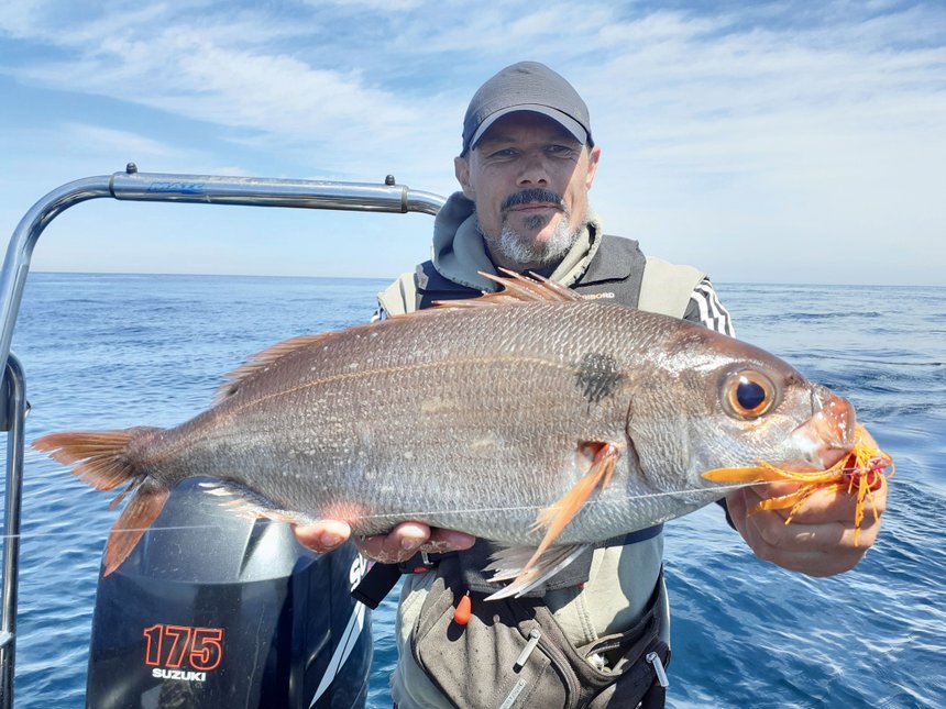 Les dorades roses sont des poissons qui se déplacent comme de nombreuses espèces à la recherche de nourriture, mais contrairement à d’autres qui vont parcourir de longues distances pour se nourrir, ces sparidés vont plutôt occuper une zone définie quasi tout au long de l’année. Cela dit, qui dit zone définie, ne veut pas dire postes précis. De toute évidence, les dorades occupent souvent le même type de zone, en revanche les secteurs et spots sont multiples. Selon les saisons l’alimentation varie, et les dorades roses peuvent se trouver entre deux eaux à un moment de l’année, comme se positionner en limite de courant ou bien évoluer autour de roches sur certains plateaux moins profonds. L’expérience fait que l’on devine où ces poissons se situent au gré des saisons. En revanche, les phases de prospections sont toujours nécessaires quand on aborde la zone de pêche. À cette époque de l’année, les tombants sont les spots à prospecter pour déloger de grosses dorades. Dans des fonds de 40 à 60 m, elles longent les parois sur la partie basse des accords, où l’on retrouve des zones encombrées, parsemées d’obstacles naturels de toutes sortes. L’alimentation est moins intense à cette saison et la profondeur importante ne facilite pas la tâche du pêcheur, mais le peu de proies présentes au fond contentent parfaitement nos beaux sparidés sur ces secteurs très propices.