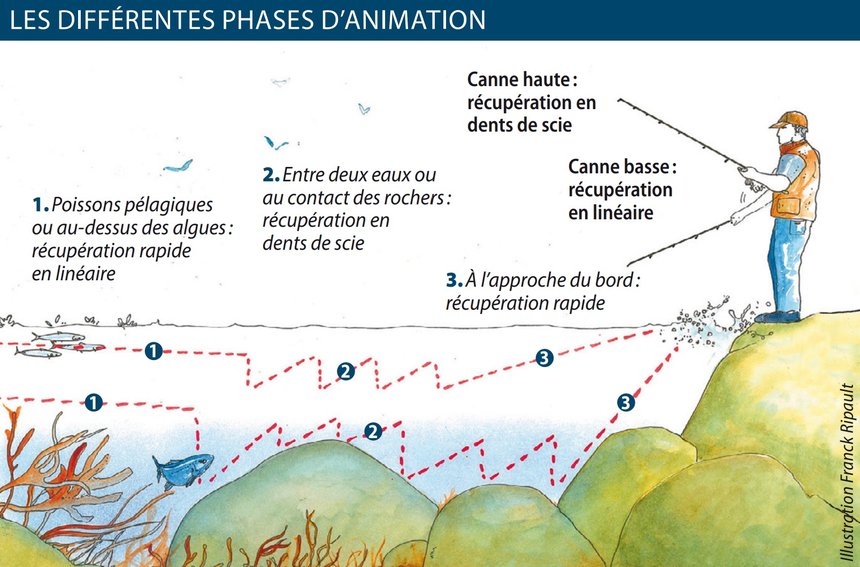 Je commence par une prospection rapide sous la surface avant de prospecter plus creux. En alternant tractions sèches et relâchés aléatoires, le lipless évolue en dents de scie, plus ou moins rapidement selon sa densité. Animation qui peut amener un bar à réagir violemment au passage. Près de gros enrochements, assises d’une jetée ou d’une digue, c’est souvent payant. À l’occasion, on peut s’aventurer dans une série de bottom tapping, canne haute, capable d’affoler les poissons embusqués dans les anfractuosités. À l’aplomb des structures artificielles (piliers de pontons ou de tabliers de quai), une pêche verticale (remontée rapide, descente lente) peut se montrer efficace. En wading, sur de faibles fonds où alternent sable, herbiers à zostères ou massifs d’algues à flotteurs, le leurre doit être récupéré rapidement pour ne pas accrocher.