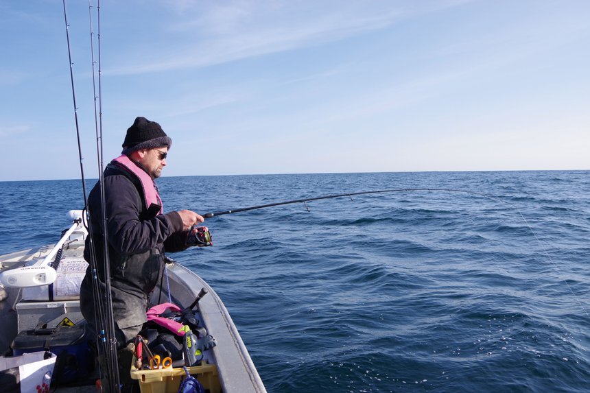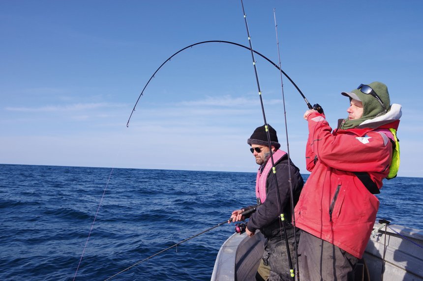 Au chapitre des paramètres importants, un bon positionnement du bateau, une dérive précise et une animation soignée valent bien plus que la meilleure des couleurs. Car il faut aussi en effet pêcher avec beaucoup de précision. Le lieu est généralement scotché sur ou à proximité immédiate d’un rocher. Le temps de passage en dérive est donc relativement court. Le moteur électrique permet de freiner cette dérive et de gagner ainsi un peu de temps pour l’action de pêche proprement dite. Cela étant, les lieus sont des poissons très méfiants: après trois passages, ils ont souvent la gueule fermée ! Sur nos spots du jour, on s’attend à toucher un poisson trophée. Mathieu me rappelle que les lieus de 7 à 8kg sont assez fréquents même si, depuis quelques années, ils sont devenus un peu plus rares qu’autrefois. Cette présence de beaux sujets est la raison pour laquelle Mathieu n’utilise pas de teaser, par exemple un classique Raglou, au-dessus de son jig. «Pour les petits sujets, un teaser est en effet très efficace, me fait-il remarquer. Mais pour viser de gros poissons, cela ne ferait qu’affaiblir le montage ! »