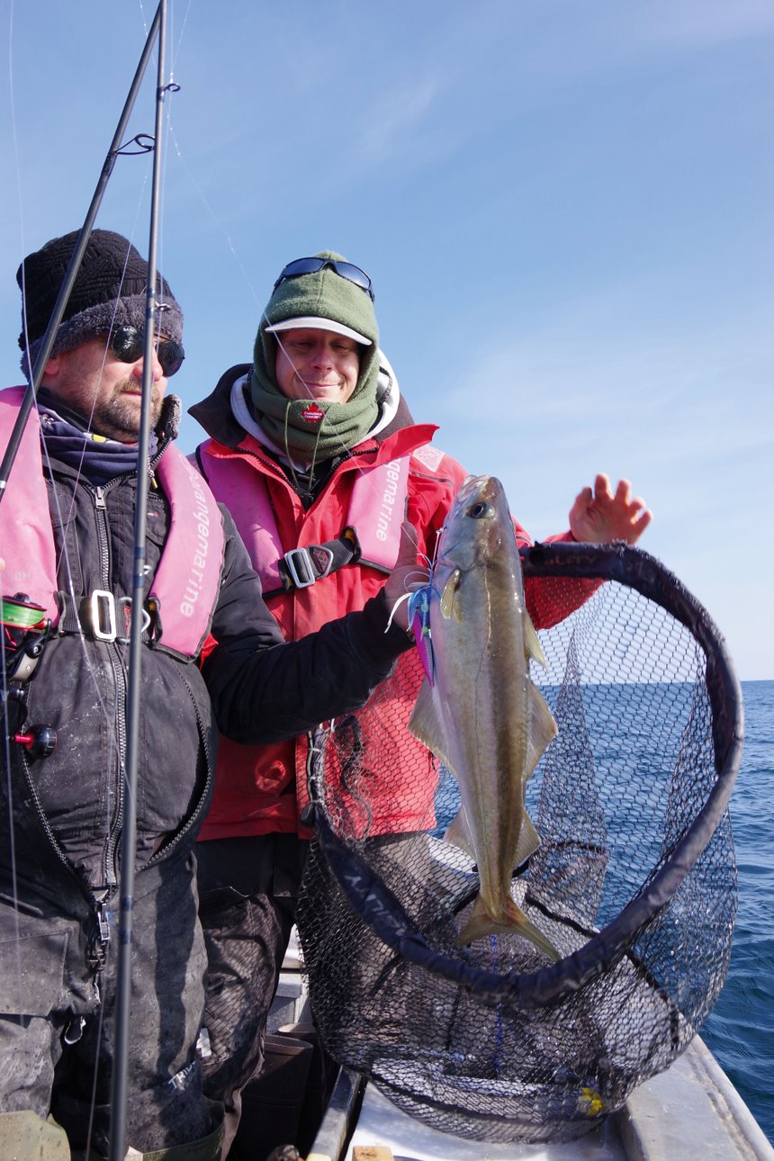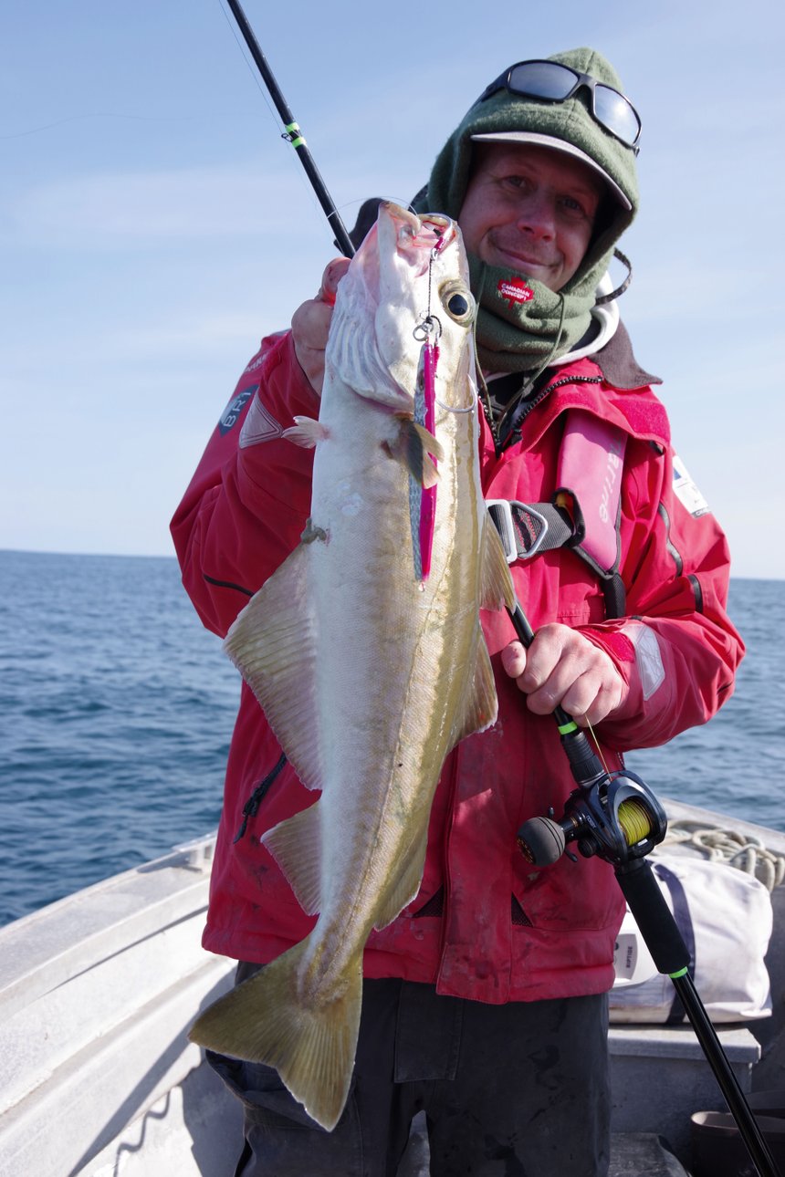 Pendant ce temps, notre ami Fabien n’est pas en reste. Les lieus semblent apprécier son inchiku dont la nage est également planante. Comme pour le slow jigging, il pratique une animation douce, en dents-de-scie mais avec un angle relativement important. Il laisse parfois son leurre, dont les assists hooks sont coiffés d’un octopus, être animé uniquement par la pression du courant. En fait, dans ce type de pêche, il ne faut pas hésiter à changer très régulièrement de leurre. Si le courant accélère, un jig effilé et lisse fendra la colonne d’eau pour être rapidement opérationnel. Si au contraire il semble ralentir nettement, un jig plat ou un inchiku sera probablement une meilleure solution. Au final, ce jour-là, les lieus se seront montrés très coopératifs mais, à part deux jolis poissons, ils étaient relativement petits. C’étaient quand même en très grande majorité ce que Mathieu appelle des « petits gros », c’est-à-dire des poissons de 60 à 70cm, très agréables à pêcher.