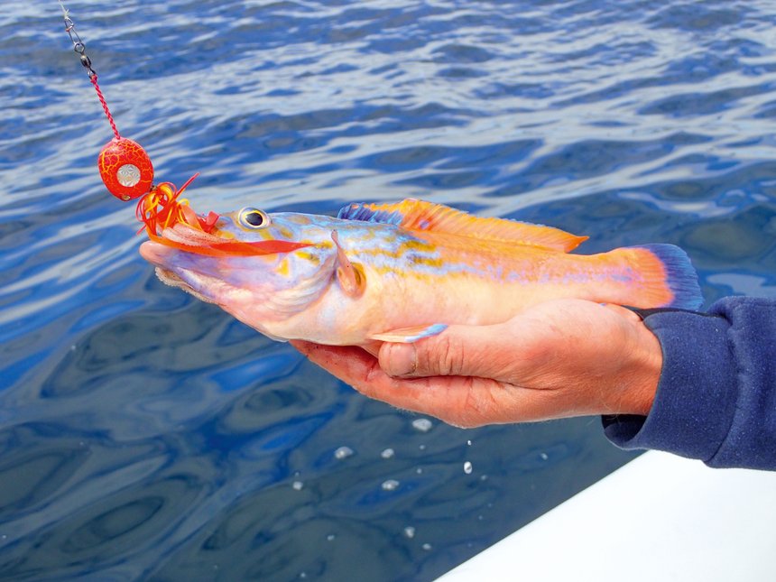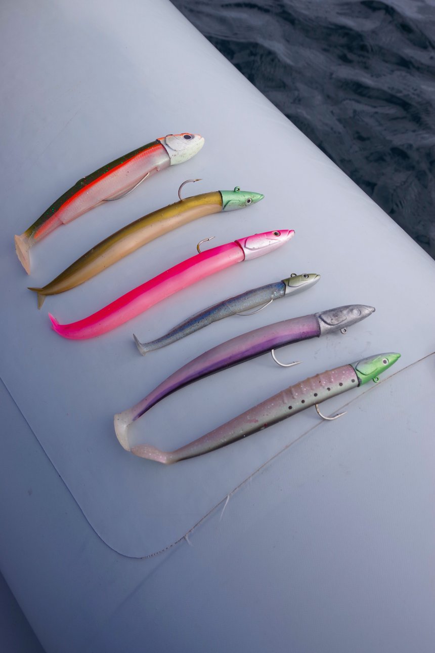 C’est sur des fonds de roche avec de petits bancs de sable dans une profondeur de 70 mètres que nous promenons nos leurres souples enfilés sur des têtes plombées effilées de 90 à 120 g. « Le grammage dépend en grande partie de la profondeur et de la vitesse de dérive. Plus elles sont importantes, suite au courant de marée, plus le poids doit être conséquent afin de gagner rapidement la bonne profondeur et de bien sentir son leurre. »