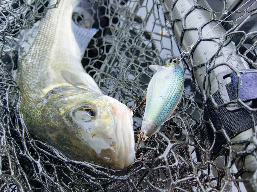 Si vous pêchez à gratter, les leurres souples (shads ou eels) sont à privilégier, une animation en « tapant » le fond de temps en temps et en faisant évoluer le leurre dans le premier mètre au-dessus du fond est souvent payante. J’ai une préférence pour les animations lentes, changeant de temps en temps de forme de tête pour faire varier la nage de leurre. Pour ce type d’animation, les shads avec un fort signal de caudale sont à employer. La rade possède des fonds allant jusqu’à 45-50 mètres (dans le goulet). La moyenne tournant autour des 15-20 mètres, pas besoin de prendre donc des grosses têtes, nous pêchons rarement avec des têtes de plus de 20 g, ce qui est déjà pas mal… Si vous grattez les bordures, des têtes de 5 à 10 g seront tout à fait adaptées, un principe que beaucoup appliquent, c’est de ne pas trop plomber… Au fil de la saison, nous descendrons en grammage (2 à 5 g, bien souvent des hameçons texans lestés), le poisson trouvant sa pitance dans les zones de bordures, nous verrons cela plus tard dans l’année. Pour les cannes, si vous aimez l’ultra-léger, canne de puissance 3/10 g, sinon un ensemble 7/28 armé d’un bon moulinet de 2500 saura répondre à la plupart des situations.
