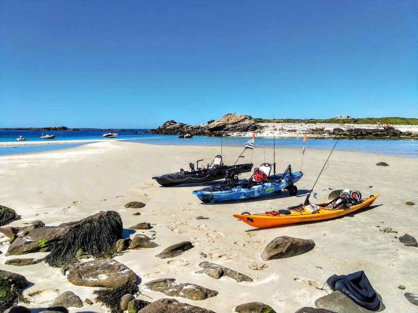 La bascule arrive et l’inversement de flux avec elle, il est temps de sortir les plus grosses têtes plombées. Il ne faut pas attendre longtemps, nous enregistrons tous nos premiers lieus ainsi que quelques petits cabillauds. En général, sur ces spots, nous prenons plutôt les cabillauds l’hiver mais depuis 2/3 ans, nous en prenons souvent l’été, ils ne sont pas bien gros malheureusement. Les plus jolis avoisinent les 3 kg mais pas plus. De temps en temps, entre deux lieus ou cabillauds, c’est un bar également qui monte au kayak. Après deux heures de ce régime, il fait toujours aussi beau et chacun ayant fait sa pêche, nous décidons comme bien souvent de rentrer vers un îlot abrité pour faire la pause repas, ce moment de partage est essentiel pour débriefer et se raconter ce qui a fonctionné ou pas pour chacun d’entre nous. Viendra ensuite le temps du retour après cette belle journée…