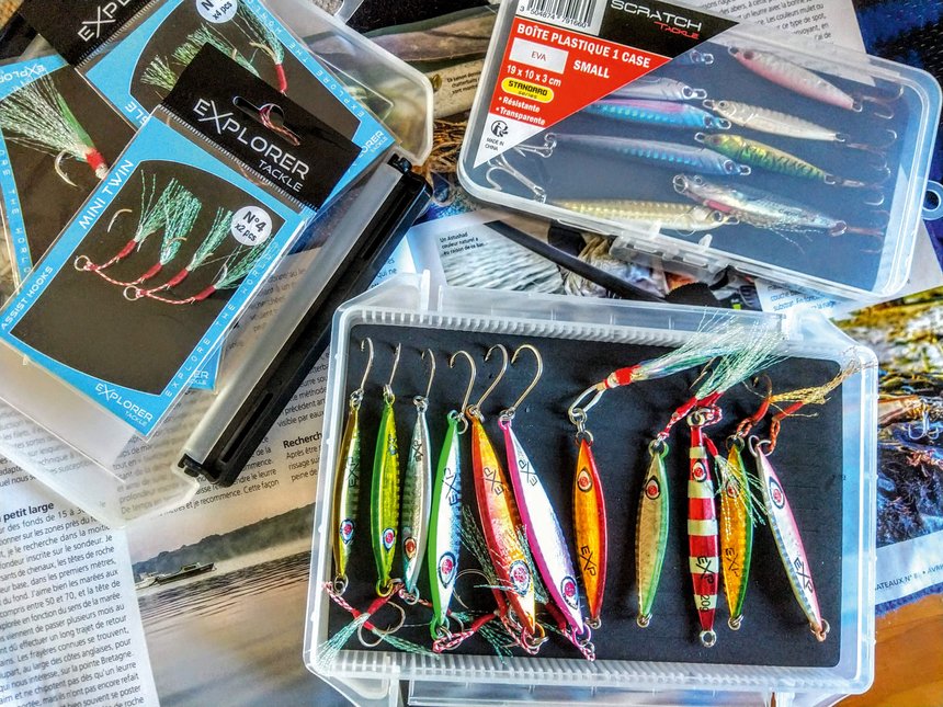 Là il faut aussi un peu de tout, au cours de la session plusieurs techniques seront mises en pratique, pour gagner du temps, préparez vos boites par grammages : une boite de leurres souples avec des grammages de 15 à 25 grammes en têtes plombées, une boite avec les grammages de 30 à 50 g en têtes plombées et enfin une boite de jigs en grammages étalonnés également. Pour les jigs, j’utilise des poids de 14 à 60 g maximum, je ne suis pas un adepte du lourd, et ces grammages sont suffisants pour travailler nos spots du petit large. Les fonds de 60 m sur nos zones sont le maximum. Je fais le choix des shads et j’utilise des corps de 8 à 15/20 cm pour les plus longs. Pour l’été les couleurs « naturelles » sont recherchées, mais en cours de session, sur les spots plus profonds, je lance quelques couleurs flashy comme l’orange ou le jaune.