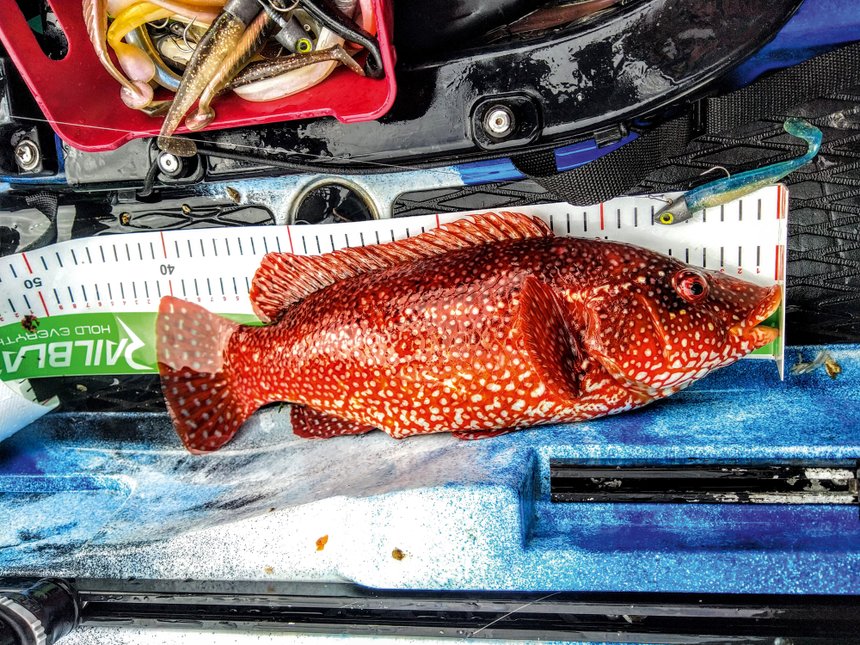 Côté matériel, il faudra revoir vos bas de ligne, les jolis poissons sont plus présents, et il faudra prévoir du fluoro carbone en 35/00 au bout de la tresse, sur une des cannes. Prenez deux cannes avec vous, voire trois. Une canne plus puissante pour pêcher les fonds supérieurs aux 40 m car il vous faudra alors employer des grammages plus conséquents et une canne intermédiaire genre 10/30 g, me semble un bon compromis. En kayak, on ne va pas sortir avec des triques. Je prends une 7/28 g avec un 2500, un PENN clash, pour les fonds jusqu’à 20 m, ma canne intermédiaire est une DAM en 10/30 g toujours avec un 2500 PENN pour les fonds de 20 à 40 m et une 12/42 g avec un PENN Slammer en 3500 pour les fonds au-delà des 40 m. Avec ces trois ensembles, je suis prêt à affronter toutes les situations halieutiques qui vont se présenter au cours de la journée.