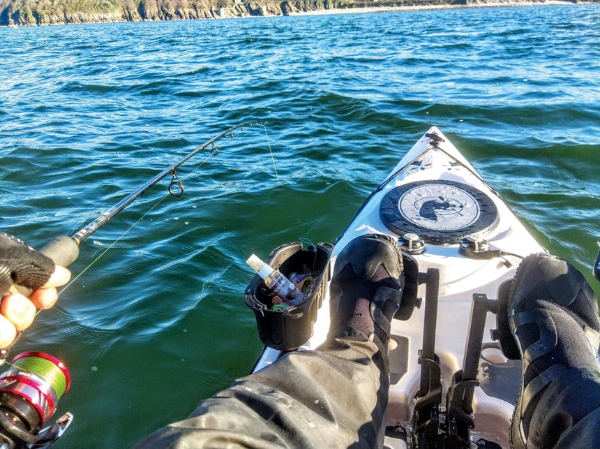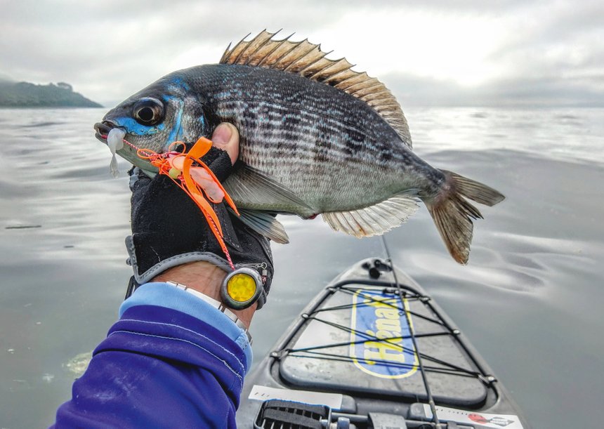Le plus léger possible est une règle de base. Selon les fonds, adaptez le grammage en conséquence Des petits leurres appâts à partir de 3 g se trouvent dans le commerce si vous voulez vous essayer au rock fishing en kayak. Pour les appâts frais à utiliser en ce début de saison, les grosses moules attirent les jolis pagres et les grises. Je choisis les plus grosses qui ont un fort byssus, ce qui va aider à les faire tenir sur les hameçons des leurres appâts. Avec ces appâts, qui sont fragiles, il vous faut utiliser une canne sensible du scion, qui saura vous transmettre la moindre activité sur votre leurre au fond de l’eau mais disposant d’une bonne réserve de puissance, car les beaux poissons ne sont pas rares. L’idéal, pour cette pêche en kayak, ce sont les marées entre 50 et 70 de coefficient, au-delà les kayaks sont trop légers et vous passerez votre temps à remonter vos dérives. N’étant pas un adepte de l’ancrage en kayak, voire de l’emploi d’une ancre flottante, je pêche en dérive lente. Recherchez les zones entre 20 et 40 mètres de fond comme le goulet, sur les tombants du chenal ou les zones autour de l’île ronde ou à l’abri de la pointe des Espagnols. Ces zones offrent les biotopes que les sparidés recherchent. L’action de pêche est justement d’utiliser cette dérive lente pour faire évoluer votre leurre appât juste au-dessus du fond. Essayez de ne pas dépasser un angle de 30° entre votre kayak et le leurre, au-delà, il y aura trop de bannière dans l’eau. Cet excès de bannière, associé à la dérive, créera un ventre dans votre ligne et votre leurre aura tendance à remonter, sauf bien sûr à utiliser de plus forts grammages qui resteront à gratter le fond. Mais, dans ce cas, vous en laisserez un maximum au fond de l’eau, d’où la recherche du grammage adapté et le principe du plus léger possible.