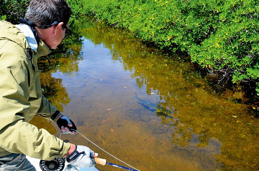 Ces poissons sont assez curieux et peuvent parfois surgir à trois mètres du bateau alors que vous êtes coincés au fond d’un cul-de-sac avec un toit végétal vous empêchant toutes tentatives de lancer. Certains guides vont même jusqu’à taper du pied sur la coque du bateau pour les attirer. Il m’est arrivé quelques fois d’effectuer ce que l’on appelle un lancer arbalète, plutôt destiné aux truites, et de ferrer des « baby » sous la canne. Ensuite, il faut juste prier pour qu’ils se décrochent car, en général, ils tombent directement dans le bateau, manquant de briser les cannes que nous avons laissé traîner, ou sur nos pieds, ce qui fait un drôle d’effet la première fois ! Dans un tout autre registre, et lorsque l’on recherche les grosses bêtes, les chenaux profonds qui séparent les îles sont des zones de passages stratégiques incontournables. Ici, il ne s’agit pas de pêche à vue. Le guide plante souvent sa perche dans trois mètres d’eau sur la bordure d’un canal aux eaux bleues, voire noires. Il est souvent impossible de savoir sa profondeur au milieu, parfois entre 3 et 8 mètres. Pour cette pêche, le plus adapté est d’utiliser une canne numéro 12 équipée d’une soie plongeante de 450 grains par exemple. Il y a souvent du courant dans ces chenaux. Au flux comme au reflux, la marée forme de véritables cours d’eau concentrant la nourriture, et donc les prédateurs. Il convient de se placer sur la plateforme avant et d’effectuer de longs lancers vers le milieu du canal. Le courant entraîne la ligne. Suivant la profondeur, on peut la laisser couler quelques secondes avant de la ramener par de longs strips assez secs pour faire vivre la mouche. Ce n’est pas la technique la plus ludique et, après quelques dizaines de lancers, on commence souvent à fatiguer ! La touche est, en revanche, sensationnelle et nous fait vite oublier l’effort. La plupart du temps, on prend une énorme tape qui manque de nous arracher la canne des mains. Lorsque je pêche de cette façon, il m’arrive de faire du Rolly Polly. Le ferrage est alors vraiment en direct et très efficace, mais gare au démarrage et à la soie qui vole dans tous les sens ! Les gros tarpons font souvent un saut au départ, la gueule béante, s’agitant en tous sens, puis enchaînent avec un énorme rush. Le moulinet tourne alors à vitesse grand V, pas question d’y mettre les doigts sous peine de perdre quelques phalanges ! Il m’est arrivé de voir disparaître plus de 150 mètres de backing sur ce premier départ. Un gros sabalo est un coureur de fond, et il faut tenter d’exercer le maximum de pression pour ne pas éterniser le combat. Lorsqu’il arrive à quelques encablures du bateau, il va falloir l’empêcher le mieux possible de monter en surface pour prendre une bonne bouffée d’oxygène et replonger de plus belle ! En effet, les tarpons font partie des rares poissons ayant des ersatz de poumons et peuvent donc « respirer » de l’air atmosphérique pour se requinquer ! C’est un énorme avantage qui permet à l’espèce de vivre dans des lagunes d’eau saumâtres avec un très faible taux d’oxygène dissout. Comme je l’ai dit plus avant, il ne faut donc pas hésiter à plonger la canne dans l’eau pour déstabiliser un peu plus le poisson et l’empêcher de rouler en surface. Cette tactique permet souvent de gagner de précieuses minutes de combat, ce qui facilite la remise à l’eau de ces supers combattants dans de bonnes conditions. Même si les grands spécimens sautent moins que les plus petits, il faut être très attentif en fin de joute pour ne pas ouvrir l’hameçon ou rompre la ligne sur un dernier coup de tête rageur, ce qui est plus que désagréable après une demi-heure de lutte acharnée !