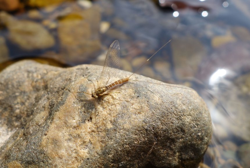 Sa période de vol restreinte sur deux mois impose un timing de réalisation prémédité. C’est inévitable, on ne peut pas se priver de l’apparition de cette mouche si commune à cet instant de la saison ! R. semicolorata jouit d’une abondance telle, que nombreux d’entre nous auront à un moment ou à un autre rendez-vous avec. Le modèle présenté met en avant les caractéristiques parlantes de ce bel éphémère, à savoir un corps globalement brun clair aux segments visibles, ses ailes bronze et contrastées, et ses pattes plus claires. Si cette imitation est la représentation type de l’imago, les montages en spent donnent aussi certains soirs de fin de printemps et de début d’été d’excellents résultats…