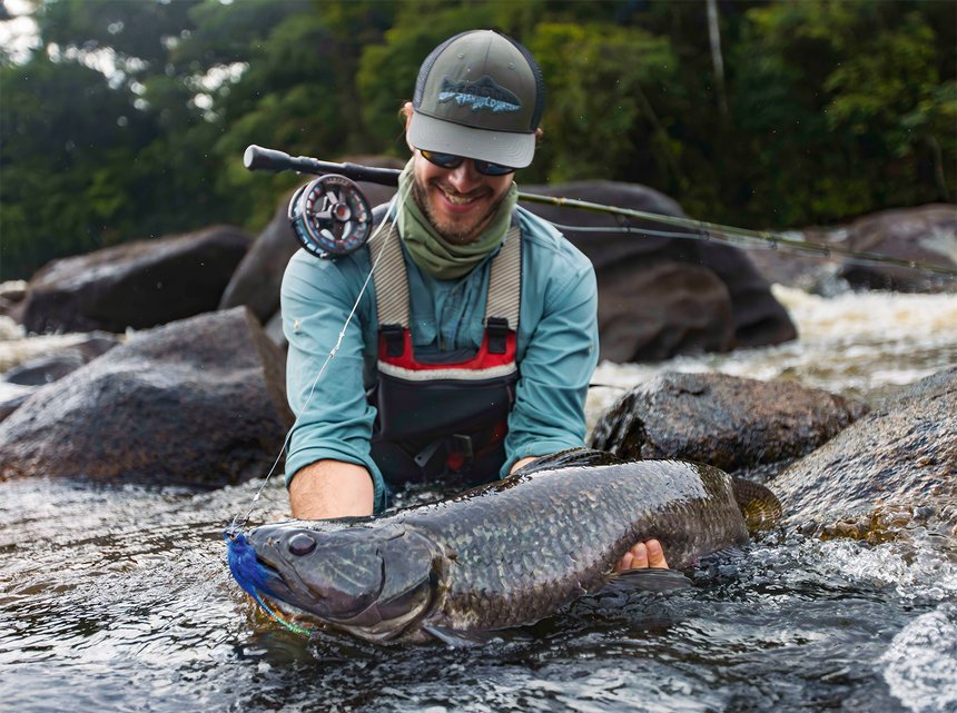 J’appelle Yann pour qu’il m’aide à épuiser le poisson piqué deux mètres en dessous de moi. Après une lutte de titan à faire des sauts de cabri de bloc en bloc, Yann met à l’épuisette le premier aimara du séjour. Ça y est, la case est cochée. Une sensation connue par toute personne ayant déjà voyagé : le soulagement couplé à la satisfaction de la première prise. Une fois le poisson dans l’épuisette, une hésitation : les dents de chien serrées sur le streamer en miette ne donnent pas vraiment envie d’y mettre les doigts ! Hors de question de percer la bouche du poisson au boga-grip. Comme pour un grand brochet, une prise délicate sous l’opercule sécurise la manipulation de cette bête préhistorique sans encombre. Après quelques photos, Hoplias aimara retrouve sa tanière immergée de granite.