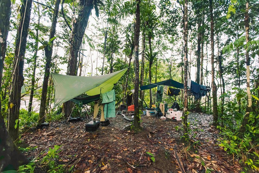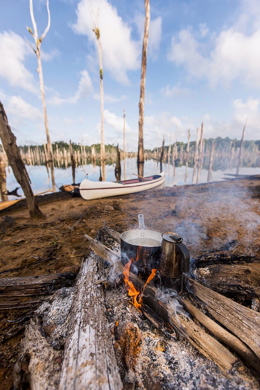 Après cette prise, nous avons enchaîné de magnifiques aimaras aux alentours de ce saut durant les quatre jours qui suivirent. Pluie torrentielle, hamacs mouillés et portions lyophilisées militaires ont rythmé nos sorties d’exploration des environs à la pagaie. Les provisions presque épuisées, nous avons dû nous résigner à quitter ce paradis vert, hors du temps, pour reprendre la navigation vers la civilisation. Après neuf jours et demi, mouchalagan chargé des restes de provisions et de nos quelques affaires personnelles, nous reprenons le chemin du retour. Sur le trajet, moins pressés par notre objectif initial, nous avons suivi le continent et prolongé notre parcours de 40 km pour explorer ruisseaux et bouts de jungle n’ayant peut-être pas croisé d’humains depuis des décennies. Aras rouges, singes atèle, capucins, singes hurleurs criant au loin leurs râles rauques du haut de la canopée et les lourdes traces de tapirs nous rappelaient tous les jours que nous étions des intrus dans cette forêt. Forcés au respect par la nature, nous avons tenté de disparaître entre les arbres immergés pour essayer d’observer le prédateur ultime, le jaguar. Lui nous a sûrement vus, mais n’a pas décidé de nous honorer de sa présence. Quel soulagement de quitter la pression des soucis non-essentiels de la vie de tous les jours. Pas de réseaux, pas de pollution. L’unique option était d’être présent là où nos pieds étaient posés, comme mis à l’heure par la forêt, nous avons docilement vécu à son rythme.
