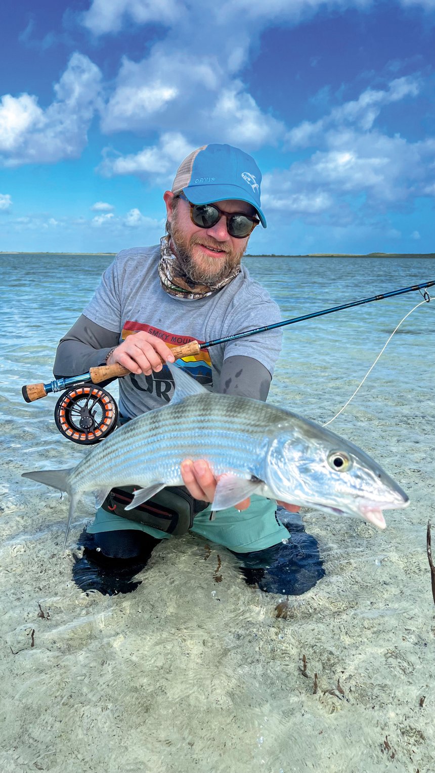 Orvil, notre guide du jour, nous sert la main et nous montons à bord de son bateau parfaitement équipé. Nous avons décidé d’un commun accord de tester un très grand flat. Herlé, Rémy et Elvis le second guide nous accompagnent sur ce spot. On ne va pas se gêner, ce sont des hectares de flats qui se déroulent devant nos yeux. Alors que nous foulons maintenant à pied le sol sablonneux jonché de conques, cette image de Christophe Colomb qui a découvert ce nouveau Monde en 1492 me vient à l’esprit… Herlé me ramène à la réalité en désignant du doigt un « nervous water ». Il s’agit d’une petite surface d’eau qui s’agite au loin. Les bonefish sont bien là. Le mieux placé c’est Rémy qui lance à la limite de la mangrove sur les conseils d’Elvis, ferrage instinctif, mais le gros bonefish casse son bas de ligne qui se prend dans les racines. Pas de chance, c’est une première pour lui. Excellent pêcheur il saura bien vite se rattraper durant le séjour… Je repère plusieurs bonefish qui se faufilent comme des diables entre les palétuviers. J’avance encore dans une sorte de petite clairière ! 5 fuseaux d’argent cherchent leur pitance. Premier lancer trop court, le second est le bon. Trois petits strips et mon premier bone du séjour démarre en trombe. Ni une ni deux je cours dans tous les sens et bride au maximum mon adversaire, ma canne est pliée à l’extrême, je la couche à droite et à gauche pour le déséquilibrer et par miracle le bas de ligne tient le coup. Superbe ! J’avais monté une série de mouches avec les poils beiges de ma chienne et les bonefish ont apprécié cette imitation renommée pour l’heure « Crazy Sally ». Nous prendrons une bonne quantité chacun de poissons grâce au talent de nos guides parfaitement affûtés et capables de repérer des « schools » à 200 mètres de votre position. Ce qui vous laisse parfaitement le temps d’ajuster vos premiers lancers…