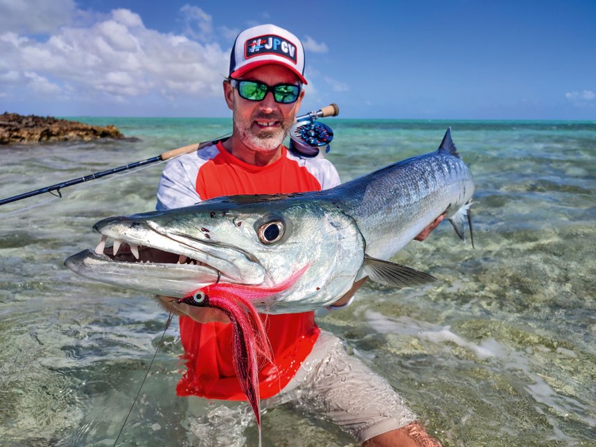 Nous sommes impressionnés par la quantité de barracudas que nous pouvons prendre à la mouche et les grands streamers chartreuses et rouges se montrent de loin les plus efficaces. Quelques requins sont intéressés, notamment un qui viendra me chiper un barracuda de 60 cm déjà sur mon bas de ligne et se fera prendre. Quelques gros barracudas clôtureront cette fantastique journée de pêche dans ce superbe atoll encore préservé ! Notre dernière journée sera consacrée aux bonefish, une espèce absolument passionnante à traquer à vue dans ce paradis des Bahamas ! C’est promis, nous reviendrons !