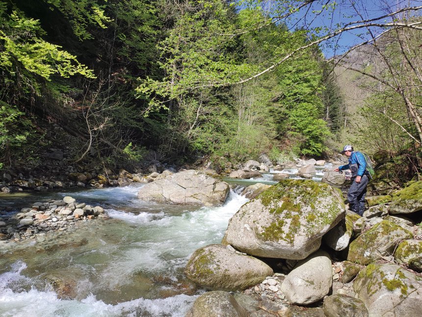 La Valsesia et ses affluents sont considérés comme le berceau de la pêche à la mouche italienne grâce à l’ancienne technique de pêche « La Valsésiana », comme en témoigne encore le musée de la pêche à la mouche de la ville de Varallo. Dès le mois de mars, les éclosions d’Echdio sont massives, puis arrive le moment tant attendu, celui des éclosions de stoneflies appelées localement « Stravacca ». La saison de pêche s’étale ici de mars à octobre. Affluent de la Sermenza, qu’elle rejoint dans le lac du barrage de Rimasco, l’Egua prend sa source dans le massif du mont Rose. Ce torrent descend en face sud de la Cima Lampone (2 789 m d’altitude). Nous avons de la chance, le temps est au beau fixe. Petit tour en voiture sur les routes sinueuses de la vallée et nous faisons la connaissance de Stéfano au restaurant la Frangalla, un personnage sympathique et haut en couleur, qui n’est autre que le garde et gestionnaire du parcours qui a su, lui aussi, à force de travail, faire de ces lieux un hot spot de la pêche à la mouche.