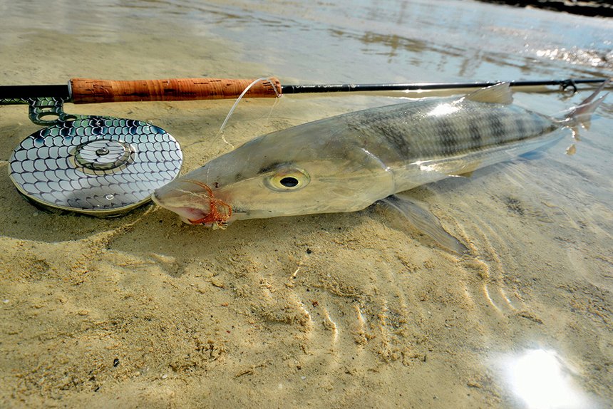 Espèce mythique pour le moucheur en mer, le bonefish a fait rêver des générations de pêcheurs. Sa vitesse et sa puissance légendaires, les paysages magnifiques où il vit, sa propension à attaquer de petits streamers, et les eaux chaudes et cristallines qui permettent de le prendre à vue… Tout cela en fait l’adversaire idéal ! Au niveau technique de pêche, le bone est, sans contestation possible, le poisson le plus adapté à la pêche à la mouche en mer sous les tropiques. Il se pêche à vue dans peu d’eau, prend bien la mouche, et ne nécessite pas un matériel trop lourd. La transition n’est donc pas très difficile pour qui pratique la pêche en réservoir, en mer sur nos côtes, ou encore la nymphe à vue en rivière. Concernant le matériel, rien de bien extraordinaire ou surdimensionné n’est requis. L’ensemble de base est une 9 pieds pour soie de 8, car il y a souvent du vent sur les flats. Toutes les grandes marques ont développé des cannes parfaitement adaptées aux contraintes du milieu marin et à la puissance du bonefish. J’utilise depuis de nombreuses années des Thomas & Thomas qui me donnent entière satisfaction, mais vous trouverez de bons modèles chez Sage, Winston, Orvis, Guideline, Echo… La canne idéale doit être en 4 brins pour faciliter son transport. Vous pouvez ainsi la glisser dans un grand sac de voyage sans avoir à traîner derrière vous un « Rod Case » encombrant que les compagnies aériennes surtaxent au moment du départ, ou « oublient » simplement de charger dans l’avion vous emmenant vers votre rêve ! Ensuite, la canne doit être rapide, pour shooter vite et facilement dans le vent. Il faut serrer la boucle et être en action en deux ou trois faux lancers maximum. Le progrès des carbones qui composent les blanks des cannes à mouche actuelles fait que rapidité ne rime plus avec barre de fer et tendinite au bout de deux jours !