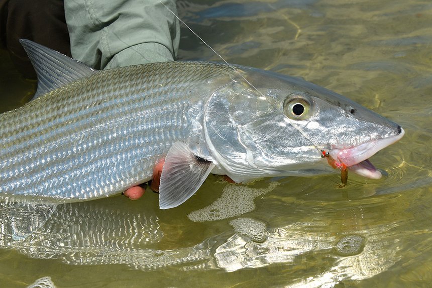 Commençons tout d’abord par une petite description de notre poisson. De la famille des Albulidae, notre bonefish s’appelle en réalité Abula vulpes. Possédant de très nombreux noms vernaculaires, il est, suivant les pays, le « macabi » en espagnol, le « IoIo » en Polynésie, la « banane de mer » aux Antilles, ou encore le « grey ghost » aux États-Unis. Son nom « bonefish » vient du mot « bone » signifiant « os » en anglais, et qui caractérise très bien cette espèce pleine d’arêtes et peu appréciée à table… Une aubaine pour nous pêcheurs sportifs ! Même les Japonais ne la mangent pas ! Il n’y a guère que dans les atolls du Pacifique qu’il continue, malheureusement, d’être capturé grâce à des pièges disposés sur les flats.