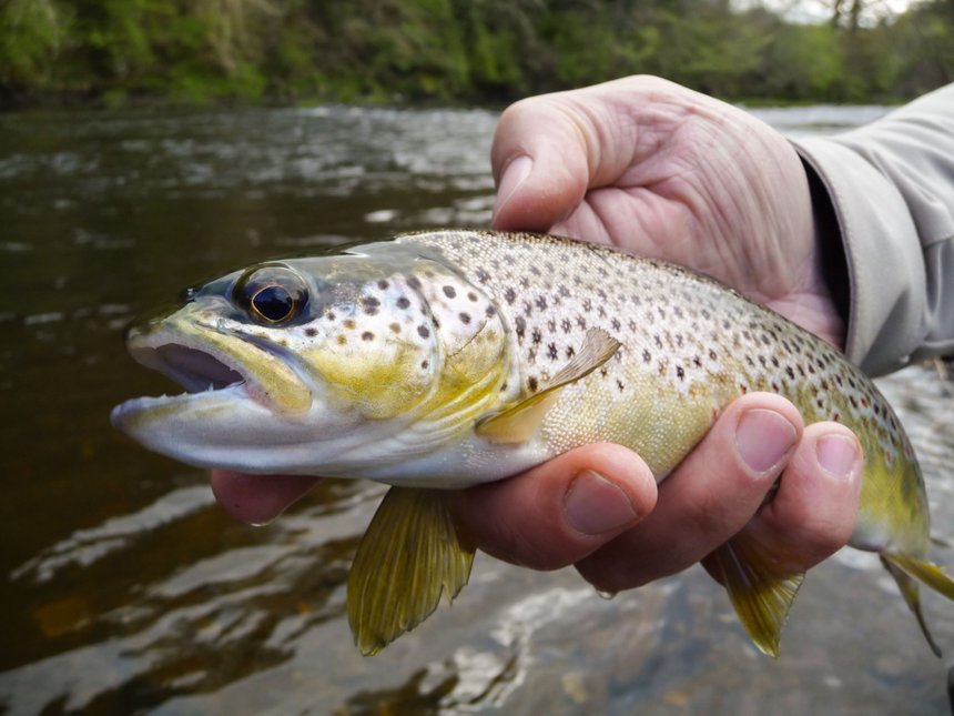 J’amorçais une dérive dans une zone que je percevais comme suffisamment profonde, l’eau paraissant plus obscure encore qu’elle ne le fût ailleurs. Ayant extirpé de mon moulinet 5 ou 6 mètres de soie, je projetais mes deux nymphes d’un geste vif en direction d’arbres se trouvant sur la berge opposée, en amont. Mon bas de ligne s’étendait convenablement et je percevais les impacts sur l’eau de chacune des deux nymphes. Soudainement, arrivée à ma hauteur, la pointe de ma soie remonta d’un coup d’une dizaine de centimètres. Cette fois, je l’avais anticipé ! Je levai spontanément ma canne, dont le carbone s’arquait sous le poids d’un poisson. Le combat était rapide : pour cause, cette magnifique brown trout n’accusait pas beaucoup plus que 20 centimètres. La défense de ce poisson était pour le moins déroutante : à la touche et au ferrage, impossible d’estimer la taille de la prise tant les premières secondes étaient violentes… La vivacité du courant n’est probablement pas étrangère à cette impression. En revanche, peu après, le combat s’abrégeait, l’agressivité initiale se dissipant. Sur la durée du séjour, ce sont plus de cinquante poissons de 25 centimètres que nous capturions ainsi. C’en était presque perturbant : ces truites étaient partout, tout le temps ! Deux zones permettaient cependant de les éviter : les courants plus soutenus et les fosses.