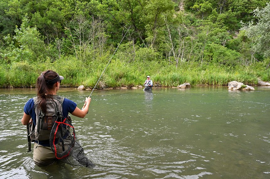 « Nous avons deux bonnes heures de pêche devant nous avant que les canoës ne surgissent. Je pratique généralement ce parcours tôt le matin ou au coup du soir. La cohabitation est de mise en période estivale. La rivière est large et tout se passe bien généralement. En journée, il faut faire attention au niveau de la rivière qui peut monter. Il convient de consulter le répondeur EDF pour connaître les variations de débit du Moyen Verdon (de 1,5 à 40 m3 /s) régulées par un lac de barrage en amont. Il faut être prudent mais la beauté du cadre de pêche est tellement incroyable… » Difficile de réfuter ce coup de cœur de Mélanie tant le site est incroyable : clarté de l’eau, roches calcaires s’érigeant en bloc, falaises à pic, rapaces qui tournoient dans le ciel. Selon son débit, la rivière offre de nombreux postes en bordure, faciles d’accès : des têtes de courant, des radiers, des fosses qu’il convient d’explorer en sèche ou en nymphe au fil selon l’activité des truites. Mélanie précise que si elles sont nombreuses sur ce secteur, elles n’en sont pas moins fantasques et malignes, notamment par bas niveaux. Quelques captures de petits spécimens nous permettront d’apprécier leur robe « blanche », mimétisme oblige, qui pourrait les confondre avec des truites de mer pour le non-initié. Par fort débit, les spécialistes locaux opèrent au streamer à la recherche des grosses farios qui remontent du lac de Saint-Croix. Chaque saison, des trophées de plusieurs kilos sont ainsi mises à l’épuisette. Un conseil, descendez sur ce secteur pour la journée, avec votre pique-nique. Le jeu des lumières au fil des heures vous fera poser la canne afin de mieux les admirer : spectacle panoramique garanti !