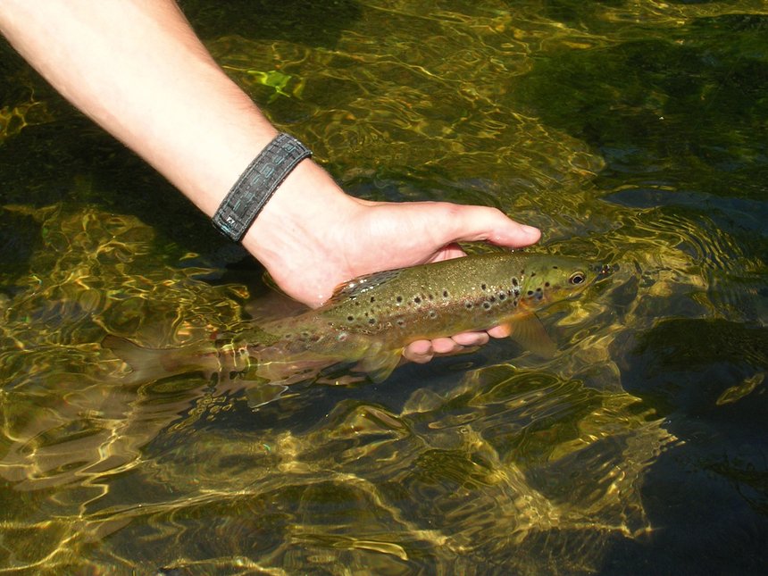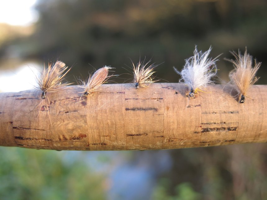 Truite : noyées rousses, grises, corps olive, jaune et brun pour le début de saison. Oreilles de lièvres et de chevreuil, taille 18/16 et 14. Petits sedges roux, bruns et noirs avec hackle en ORL ou ORC. Mouches de mai en taille 10 et 12, jaunes et blanchâtres olive en CDC, S. Ignita émergent, et spent. Scarabées en foam ou poil de cervidés. Fourmis, sauterelles jaunes/vertes, moucherons en taille 18 et 20.