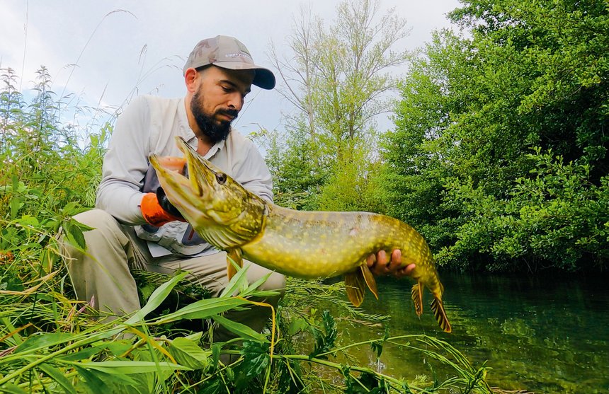Au contraire, pour les pêches lentes avec par exemple des streamers « suspending » ou de surface, je vais préférer le fluorocarbone de 50 à 90 centièmes. J’utilise la plage de 50/60 pour des pêches de printemps fines en eau claire, où les longues pauses sont souvent nécessaires. Sur ces pêches visuelles, avec un peu d’entraînement et de self-control (pour ne pas trop appuyer les ferrages), il est tout à fait possible d’affiner la pointe pour laisser au streamer plus de liberté de nage. N’oubliez toutefois pas de diminuer la finesse du fer de votre hameçon pour faciliter la pénétration de celui-ci sur des ferrages plus « doux ». J’utilise un bon 70/80 centièmes pour les pêches de surface. Les poissons ont toujours tendance à nous surprendre lors de ces pêches, un ferrage brutal nécessite l’emploi d’un avançon fort. De plus, les brochets, bien que très maladroits, ont tendance à vite engamer les streamers de surface lorsqu’ils ont réussi à enfin « cadrer » leur prise. Sur mes avançons acier, une agrafe dite « rapide » me suit depuis des années sans aucun souci de fiabilité. Quant au fluorocarbone, j’utilise un nœud agrafe, simple mais terriblement efficace. Il m’accompagne même en exotique sur les poissons les plus exigeants. Réalisation du nœud agrafe : prendre un fluorocarbone dit « hard », effectuer un petit « champignon » à l’extrémité avec un briquet puis former à quelques centimètres un simple nœud. Passez le « champignon » dans l’œillet de votre mouche, puis repassez-le dans le nœud simple. Serrez après avoir ajusté la longueur de la boucle ainsi formée et c’est fini !