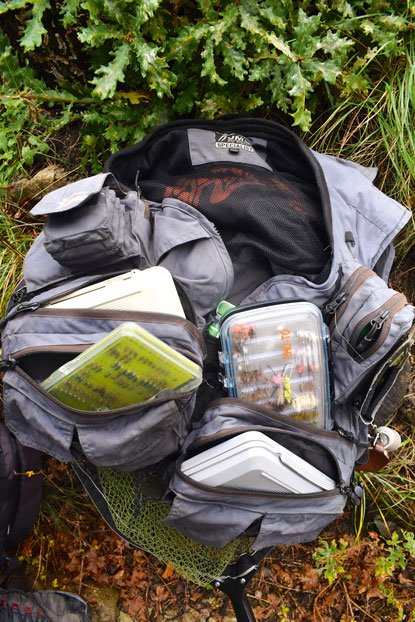 Le gilet Il équipe tous les pêcheurs depuis la nuit des temps et, malgré la concurrence, il semble traverser les années avec une certaine quiétude. Il s’agit d’un indémodable encore bien apprécié et, même si sa capacité de stockage varie entre l’entrée de gamme et le haut de gamme, elle reste souvent plus élevée que celle des chest packs. Les nombreux accroche-accessoires permettent au moucheur une accessibilité directe et rapide à chacun d’entre eux. On ne cherche pas ses accessoires, on les a directement à portée de main. Avec un petit piquenique à l’arrière, le parfait équilibre du gilet en fera un partenaire idéal pour les longues sessions. Durant celles-ci, on est parfois obligé de passer rapidement d’une technique à l’autre avec des poissons qui se nourrissent de proies variées dans différentes couches d’eau. Des espèces autres que les salmonidés peuvent également s’activer. Il serait alors dommage de passer à côté d’un beau chevesne et autre barbeau à pêcher en nymphe. Il nous faudra donc plusieurs boîtes garnies de sèches, nymphes, noyées ou streamers. Même peut-être plusieurs bas de ligne et, dans ce cas, le gilet remplit parfaitement ses fonctions. Cependant, une bonne organisation est de rigueur, sous peine de s’y perdre rapidement. À l’inverse du chest pack qui, rappelons-le, concentre la totalité de notre matériel sur l’avant, le gilet possède quant à lui plusieurs poches et tout doit être rigoureusement rangé à sa place à chaque utilisation…