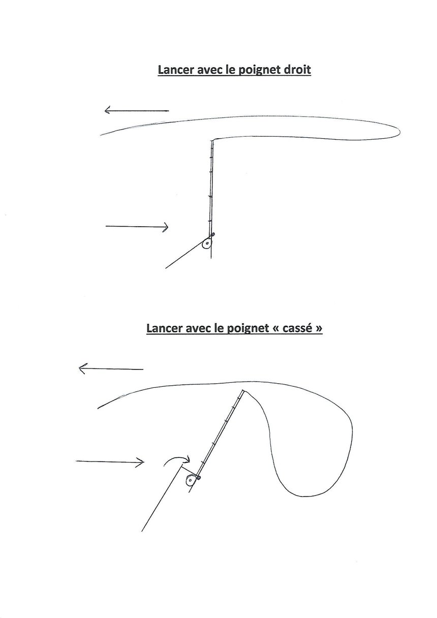 Les blocages. Incontournables, ce sont eux qui procurent la force nécessaire à votre bas de ligne pour qu’il puisse se dérouler parfaitement sur l’eau. Ils permettent à votre canne de faire parler toutes ses qualités de lanceuse. En effet, lors de chacun d’eux, le bas de ligne est véritablement propulsé pour ensuite se tendre avant d’être redirigé par votre bras dans le sens opposé. Les faux lancers deviennent alors une simple succession de blocages, tensions et changements de directions.