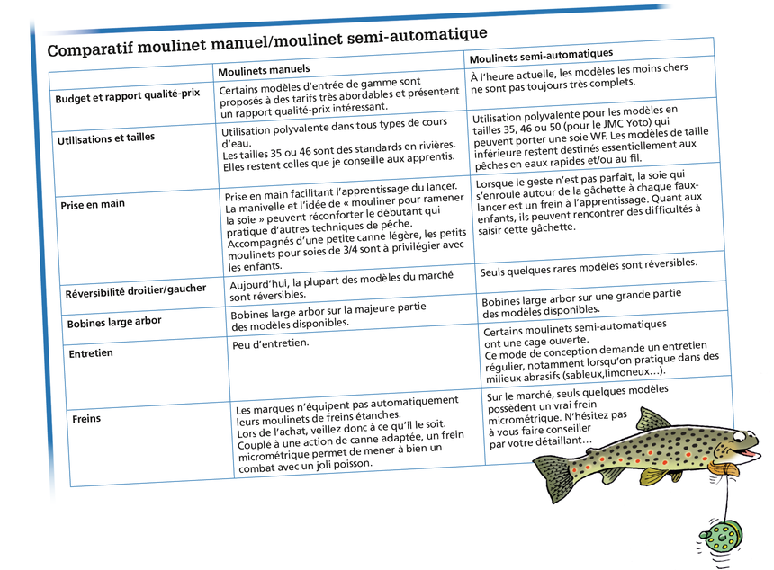Il ne faut également pas négliger le côté ergonomique du moulinet. On a tous des morphologies différentes qui jouent automatiquement sur la prise en main des objets. Par exemple, un moulinet en taille 35 sera plus petit et léger qu’un autre en taille 46. Ce critère est d’autant plus important lorsque l’on s’adresse à des enfants. Pour les gauchers, assurez-vous que votre future acquisition soit bien réversible droitier/gaucher. Souvent, un simple tour de main suffit à faire le changement. En ce qui concerne l’aspect du moulinet, celui-ci doit posséder une bobine dite « large arbor » (gros diamètre au moyeu de la bobine). Ce qui signifie qu’en action de pêche, la récupération sera rapide et l’effet de mémoire de la soie réduit. Au début, l’entretien ne doit pas être une corvée. Et, même s’il reste primordial pour faire durer le matériel dans le temps, il doit se limiter selon moi au rinçage à l’eau claire, au séchage et au graissage deux fois par an. Pour cela, une mécanique simple couplée à un démontage facile fera le bonheur du moucheur en herbe. Enfin, telle la cerise sur le gâteau, un frein micrométrique et bien réglé viendra réconforter le pêcheur en cas de combat avec un beau poisson. Il doit être étanche pour contrer les immersions récurrentes et imprévues…