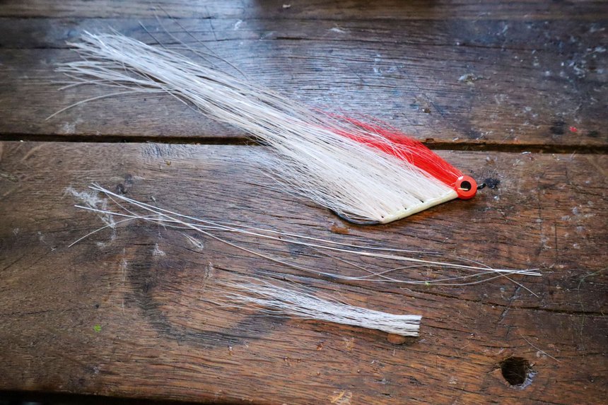 Deceiver (avec ou sans tail) Hampe moyenne ou armement double « stinger », avec VMC ou partrige patriot Bucktail monté en ligne de part et d’autre de la hampe. Une en queue et une en tête. Séparé par une chenille longue Une dizaine de fibres de flashabou magnum suffisent pour la queue et pour la tête Classique sur une base œil plat/résine UV.