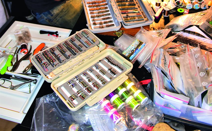 L’offre étant aujourd’hui très vaste, inutile de se surcharger avec des matériaux qui ne serviront pas ou peu. Alors pour les sèches et les nymphes, l’idéal est de commencer par un fil de montage aussi fin que résistant et, pour cela, j’ai depuis quelques années troqué mon classique 8/0 contre un Nano Silk 12/0. Les couleurs noir, vert olive et orange sont celles que j’utilise le plus. Ensuite il faudra choisir les dubbings pour les corps et les thorax. Le dubbing de lièvre poils courts reste un classique et nous pouvons nous en procurer dans plusieurs tons allant du naturel au noir en passant par le brun et la couleur olive. Pour les sèches, nous pouvons utiliser des dubbings hydrophobes type dubbing de cul de canard ou encore dubbing synthétique Dry fly. Il faudra également se procurer un tube de poix pour fixer la matière sur le fil de montage. Il est possible de faire la même chose avec des plumes de faisan mais la couleur d’origine est la plus utilisée et reste très prenante dans beaucoup de cas de figure. Nous utiliserons ce matériau pour les corps et les cerques des nymphes uniquement. Côté billes tungstène pour les nymphes, les couleurs classiques or, argent et cuivre feront parfaitement l’affaire pour démarrer. En revanche, il sera nécessaire de les avoir en tailles 2 mm, 2,4 mm, 2,8 mm, 3,3 mm et 3,8 mm. Pour le cerclage des corps de nymphes, rien de tel qu’un bon fil de cuivre fin et moyen à enrouler en spires non jointives. Le fil Néon est parfaitement adapté au montage de tags bien visibles. Les orange, rouge, rose ou encore vert sont les plus courants. En finition, le vernis clair est toujours très bien pour solidifier les nœuds finaux de toutes nos imitations.