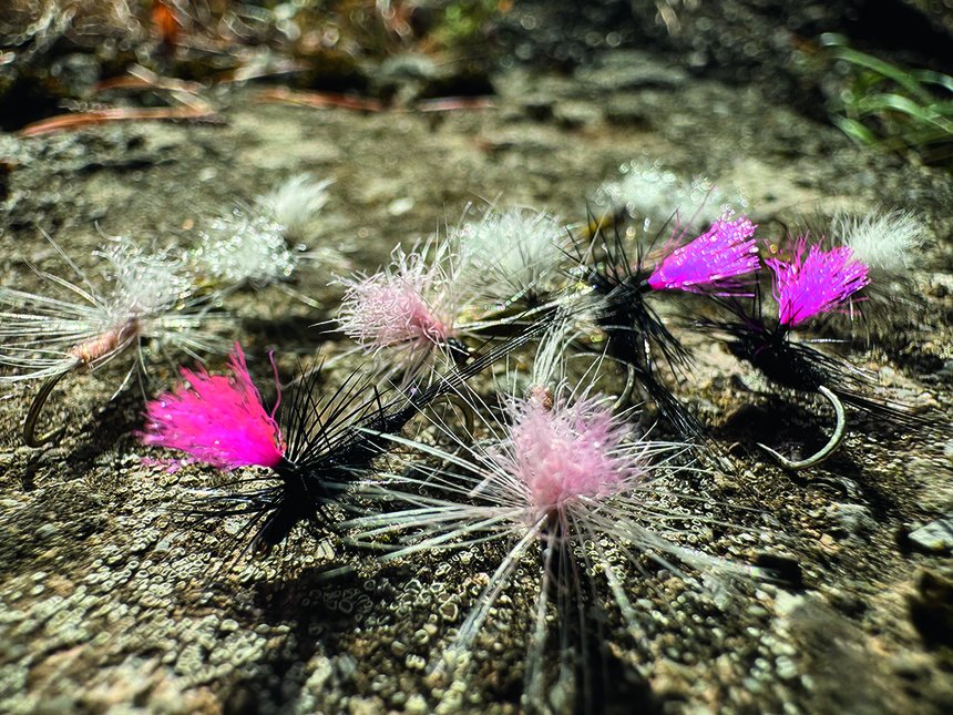 À l’inverse de la pratique sur l’eau, je conseillerai aux monteurs en herbe de débuter par les nymphes à billes pour plusieurs raisons. La bille matérialise rapidement la tête de la nymphe et évite au monteur une étape supplémentaire. Les truites sont moins re gardantes sur l’aspect global d’une nymphe et, par exemple, si votre thorax est un peu plus fourni que la normale ou si votre cerclage n’est pas vraiment uniforme ceci n’empêchera pas un poisson de s’en saisir. Il faudra bien sûr rester un minimum cohérent et réaliste et ne pas proposer à nos partenaires de jeu des imitations inadaptées, trop excentriques ou encore trop chargées en matériaux. On peut tout à fait commencer le montage de nymphes à moindre coût avec une diversité réduite de matériaux. Avec un peu de pratique, le « découpage » cerques / abdomen / thorax / tête sera parfaitement maîtrisé et le passage au montage de mouches sèches ou encore d’émergentes se fera relativement facilement. Savoir monter des sèches implique la maîtrise de certaines notions d’entomologie mais aussi de certaines étapes de montage. Notamment la gestion de la quantité des matériaux employés, la maîtrise des proportions et la connaissance des propriétés hydrophobes des matériaux. On y viendra donc en second temps dans l’apprentissage…