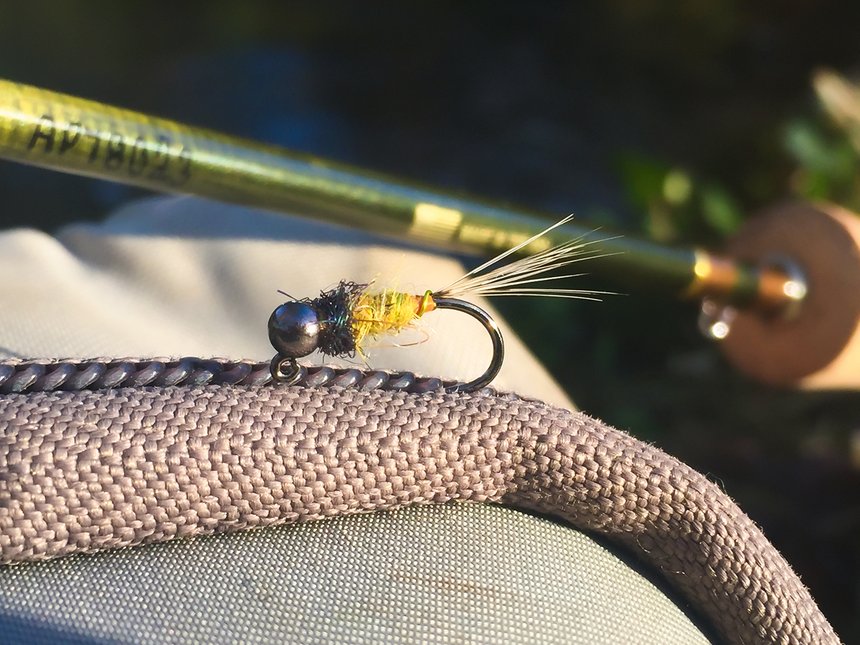 On peut la monter sur hameçon jig pour l’utiliser en pointe, mais aussi sur hameçon droit pour la mettre en potence. Une nymphe simple comme toujours, mais qui prend son lot de truites ! J’apprécie la bille noire, mais j’en monte aussi avec d’autres couleurs et varie les poids pour m’adapter aux postes.